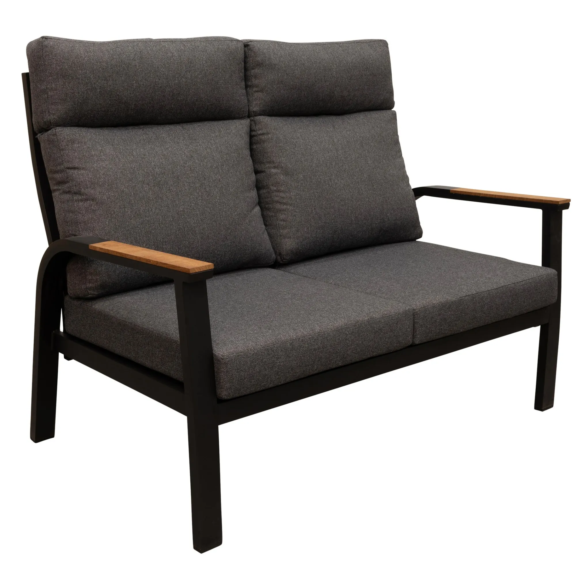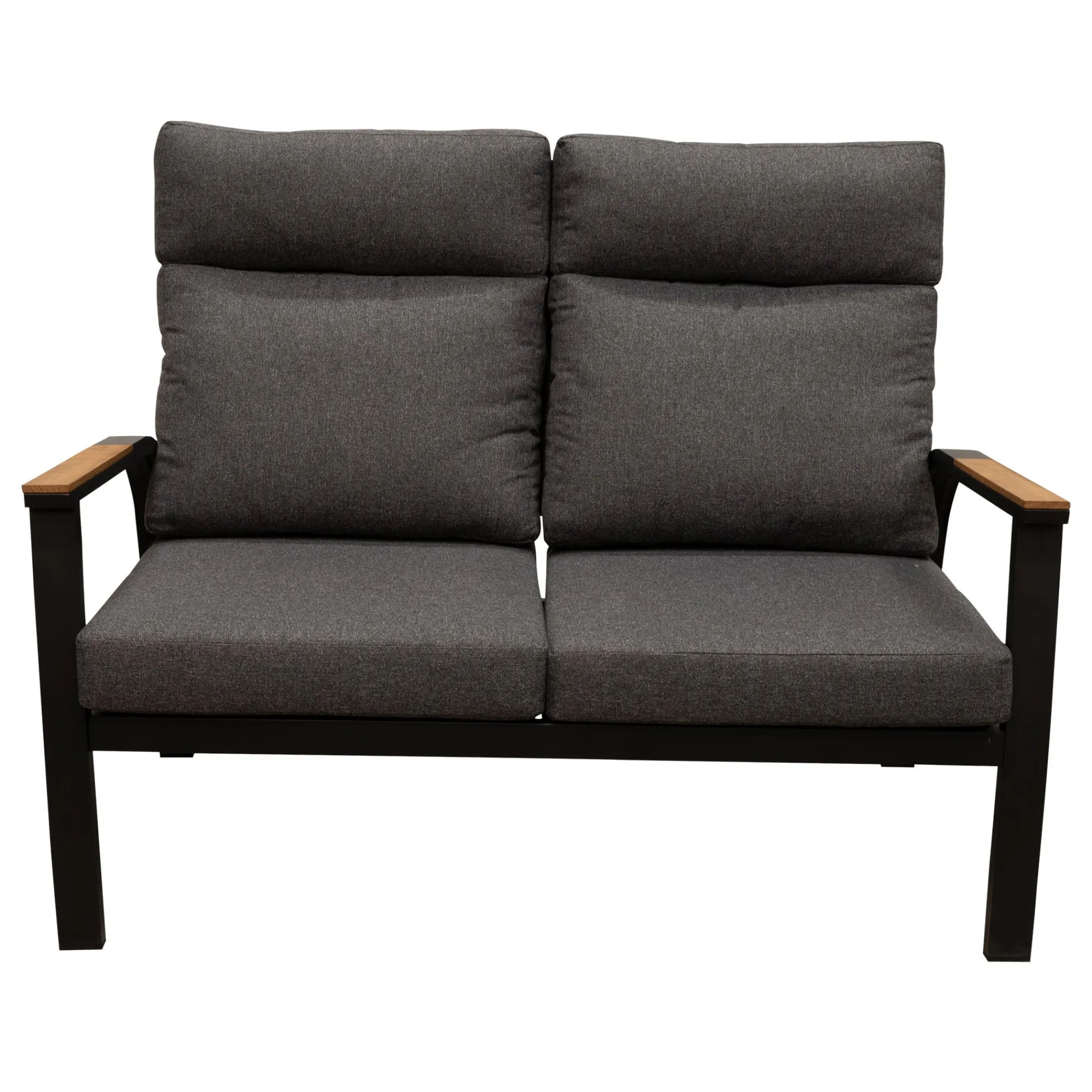 De Harston bank met 2-zit is een stijlvolle en moderne bank die goed past in verschillende stijlen. De zwarte kleur geeft de bank een luxe uitstraling. Het strakke ontwerp en de robuuste constructie maken de Harston bank een duurzame keuze voor dagelijks gebruik. De bank is van Aluminium en is afgewerkt met teak hout op de armleuningen.
