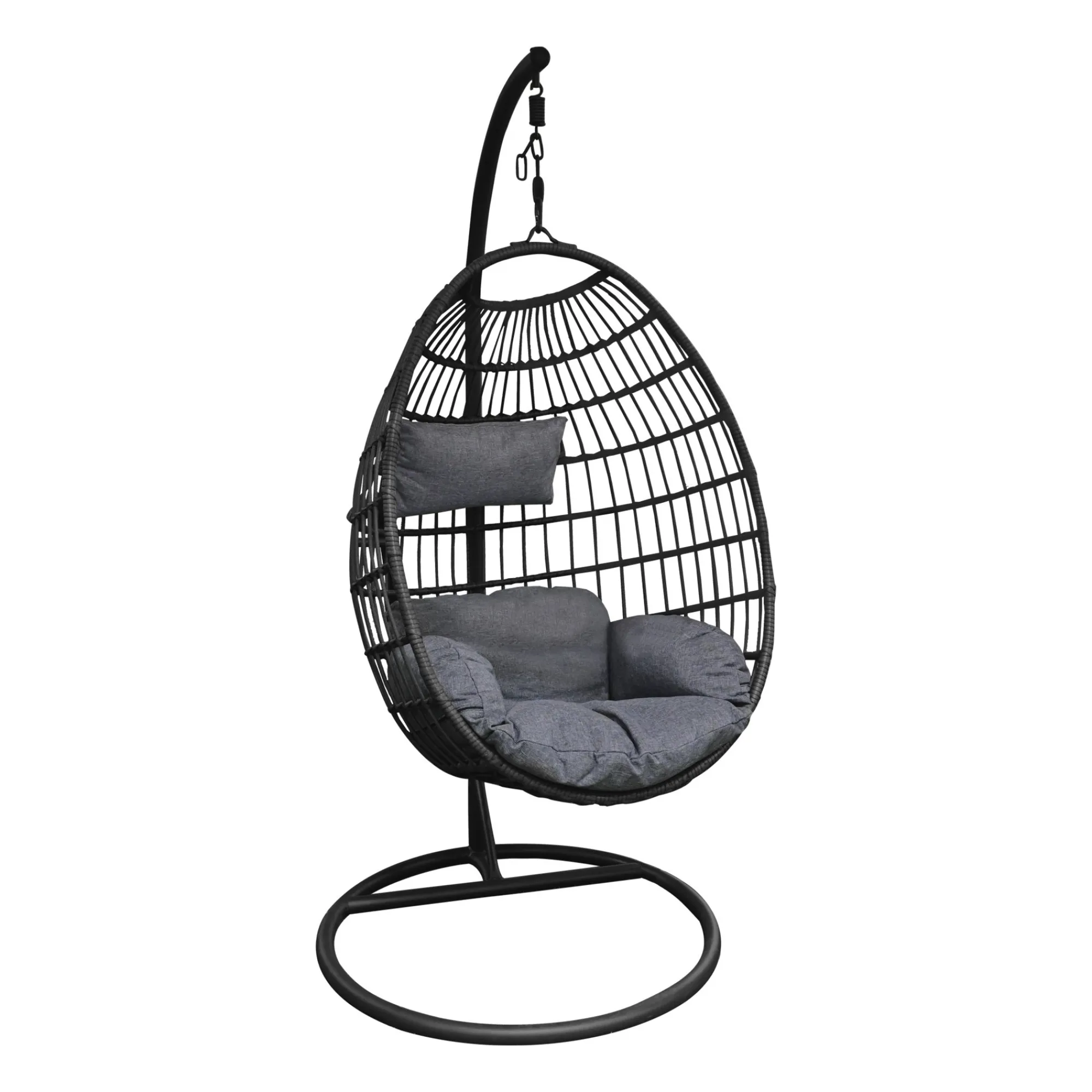 De Hangstoel Giavo in antraciet combineert modern design met comfort. Het duurzame kunststof vlechtwerk is UV- en weerbestendig, terwijl de meegeleverde kussens en staander zorgen voor ultieme ontspanning in je tuin of op je terras.