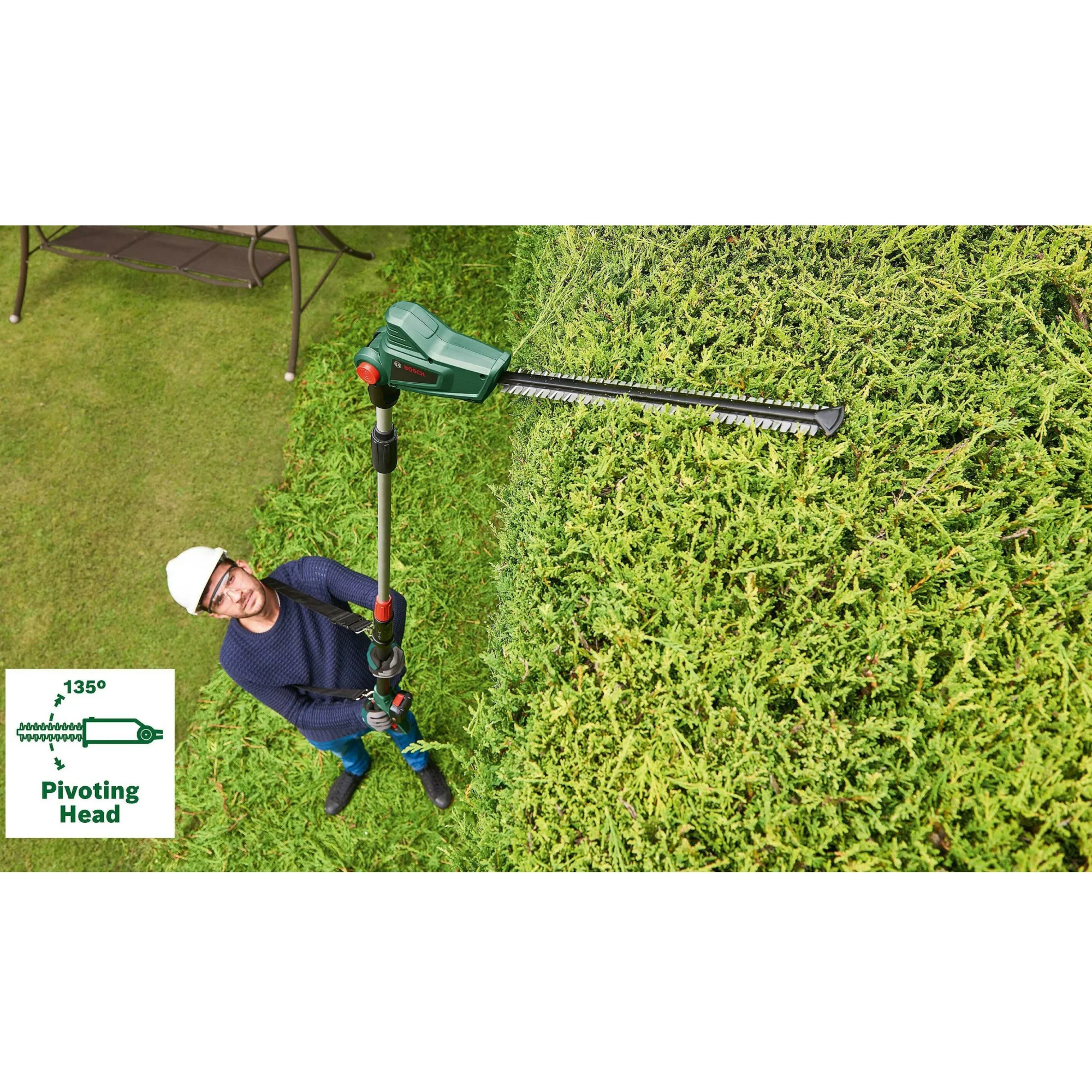 De perfecte oplossing voor het snoeien van hoge struiken en heggen. Voorzien van een telescopische handgreep voor comfortabel werken op hoogte. Het ergonomische ontwerp en het lichte gewicht zorgen voor gebruiksgemak. Werkt op een accu, wat het apparaat mobiel en milieuvriendelijk maakt. Geschikt voor zowel professionals als tuinliefhebbers.