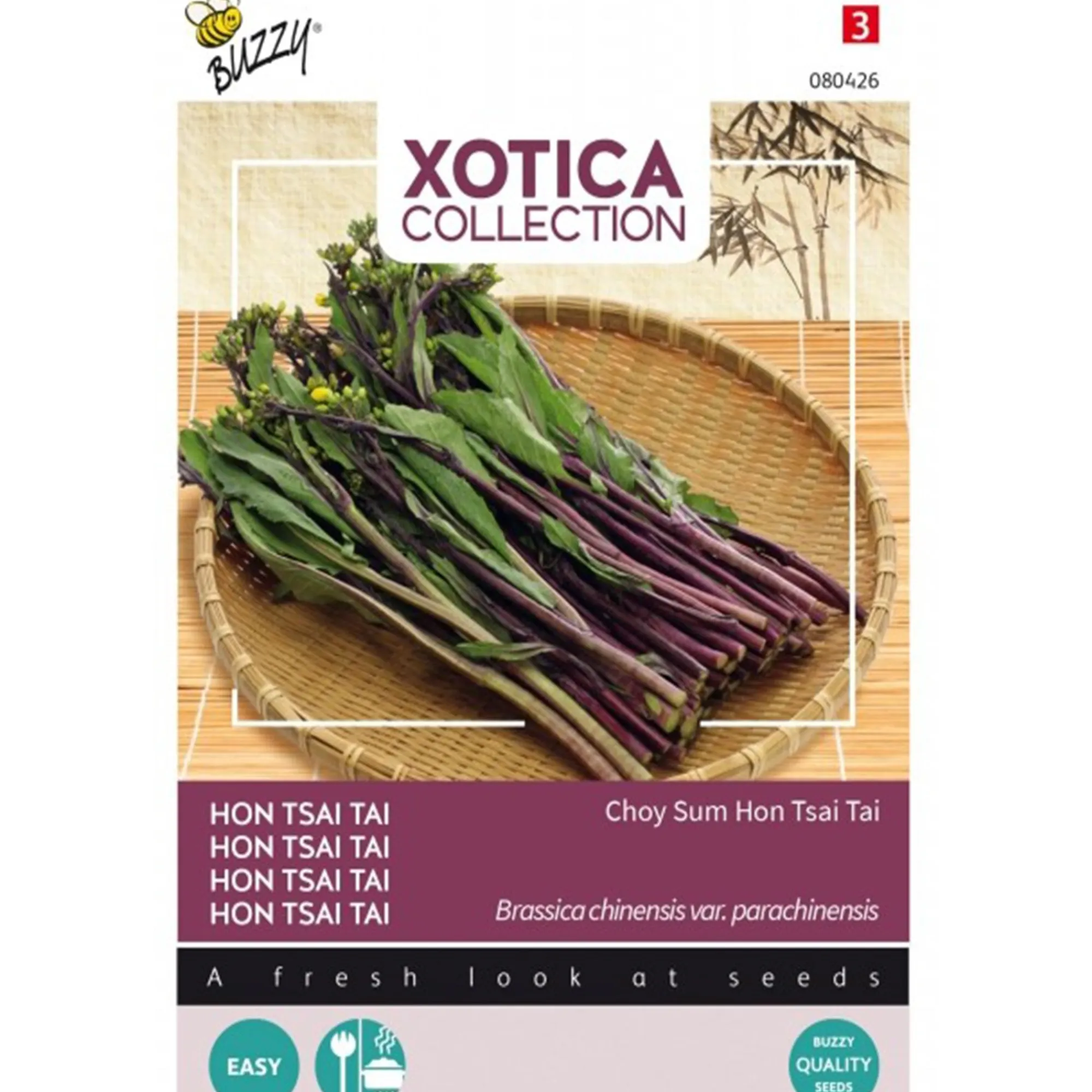 Paarse Aziatische bladgroente met eetbare stengels, bladeren en bloemknoppen. Licht pittige smaak, ideaal voor roerbakken of stomen. Snelgroeiend, geschikt voor pot of volle grond.