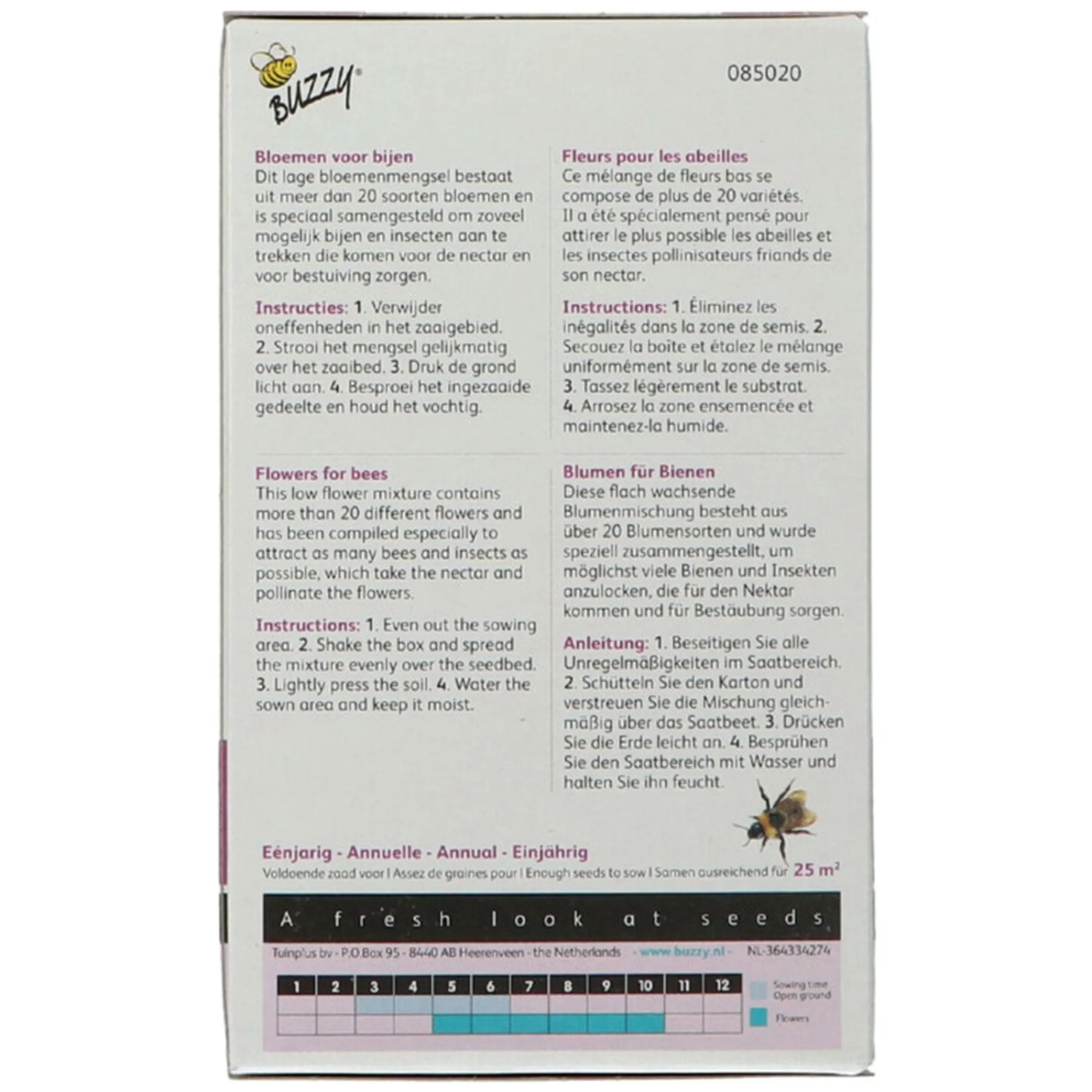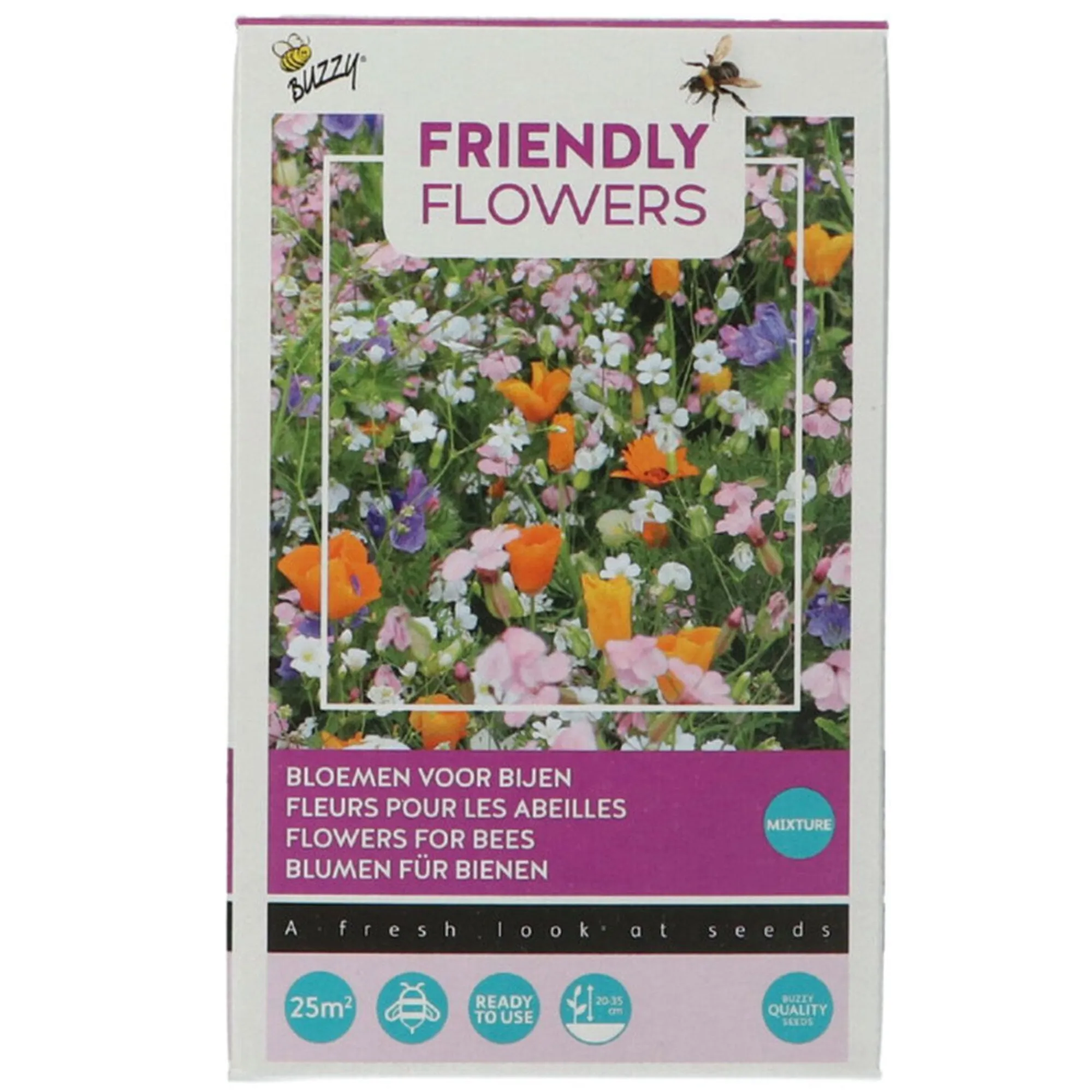 Perfect voor het creëren van een bloemenhoek die bijen aantrekt en de bestuiving bevordert. Het mengsel bevat diverse bloemen die het hele seizoen kleurrijk bloeien. Geschikt voor tuin, balkon of bloembed.