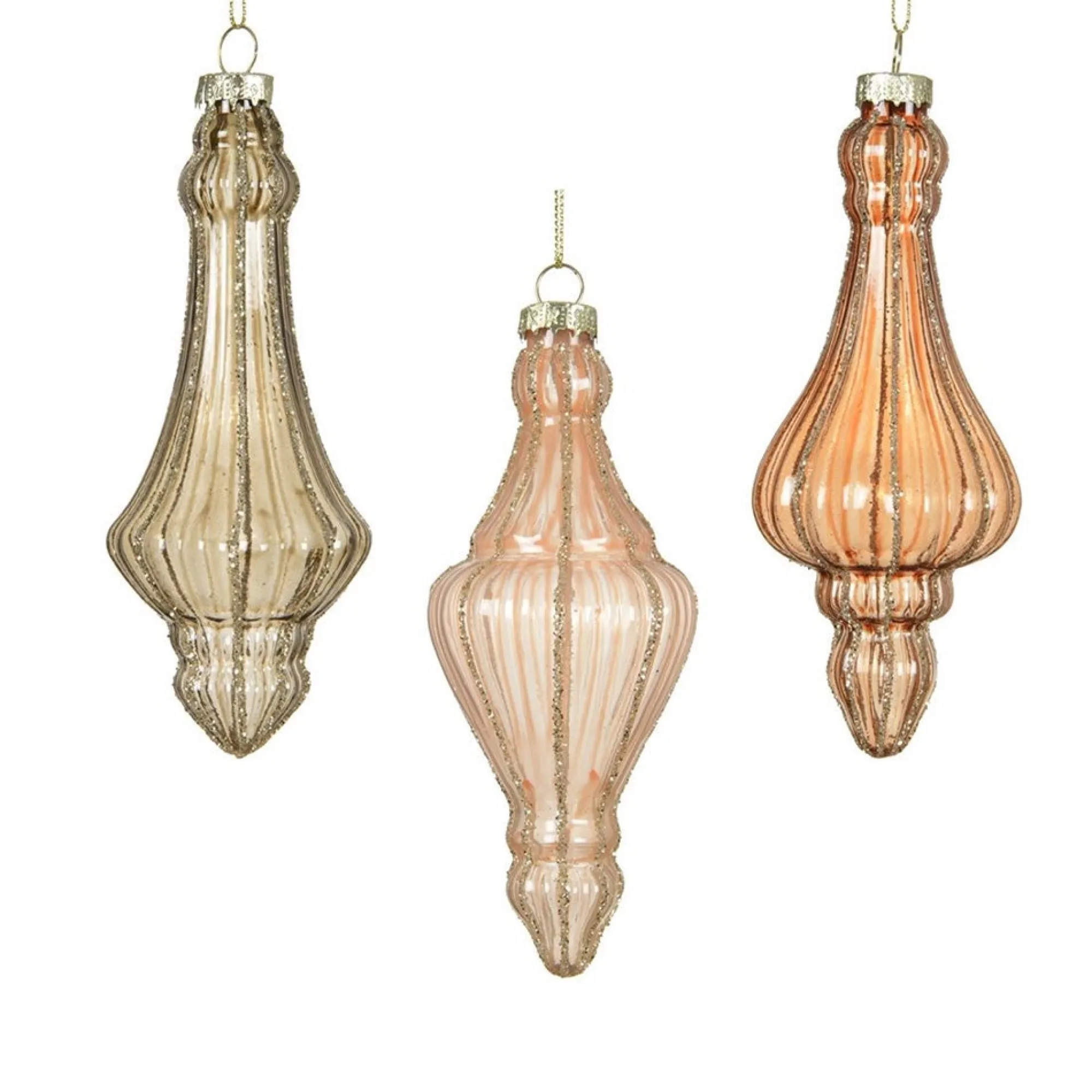 Glazen hanger van 14 cm met elegante ribbelstructuur en gouden accenten. Verkrijgbaar in drie kleuren voor een stijlvolle kerstdecoratie.