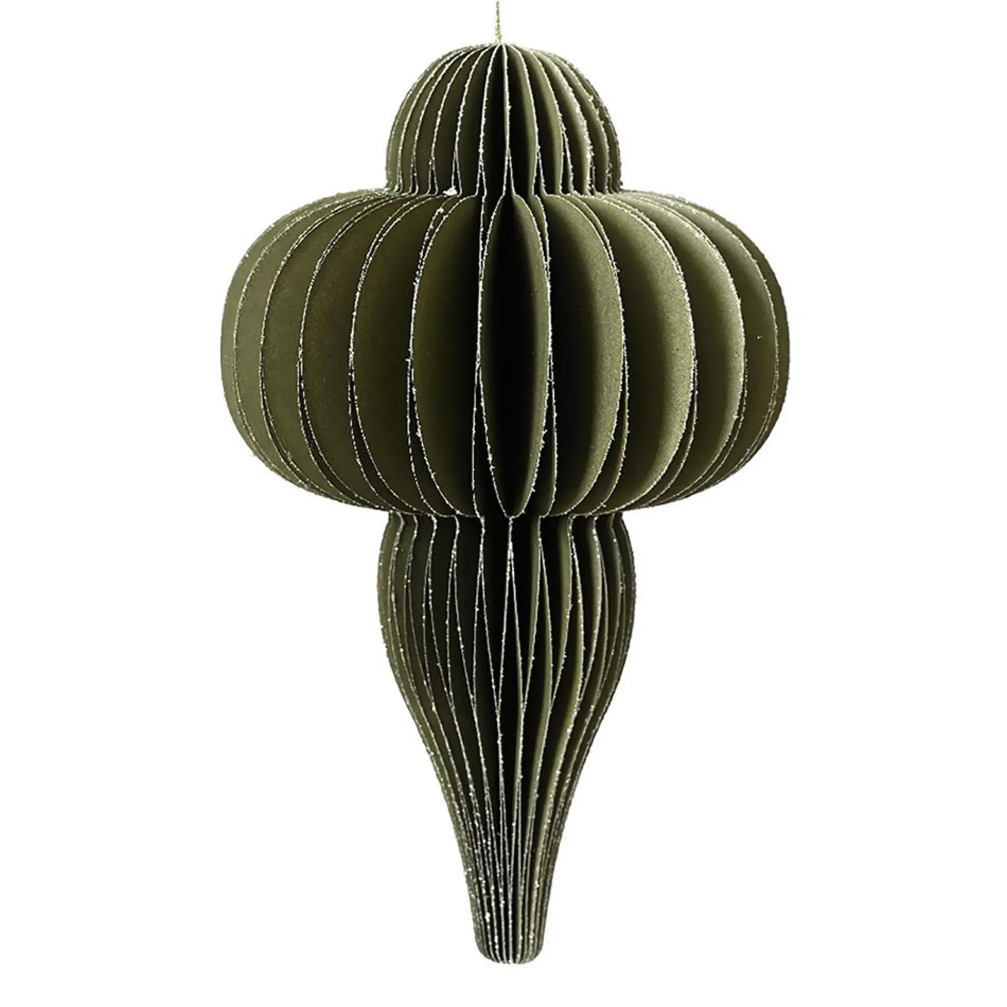 Papieren kersthanger in een elegante groene kleur met pegelvorm. De hanger heeft een gevouwen structuur met fijne glitterdetails en is 15 cm hoog. Ideaal als subtiele kerstdecoratie voor in de boom of aan een tak.