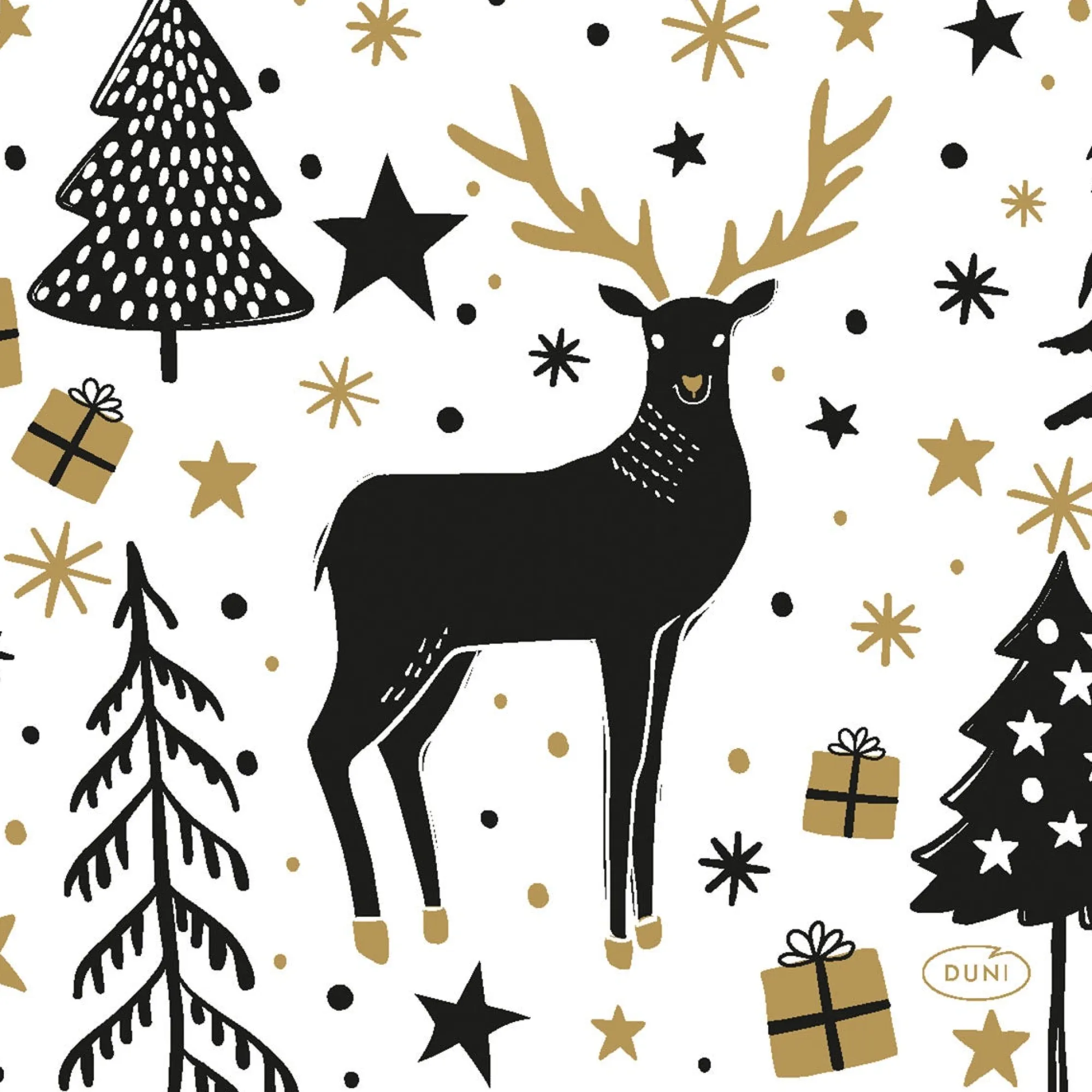 Papieren servetten met feestelijk rendiermotief in zwart en goud. Ideaal voor het dekken van een stijlvolle kersttafel of bij het serveren van hapjes tijdens de feestdagen.