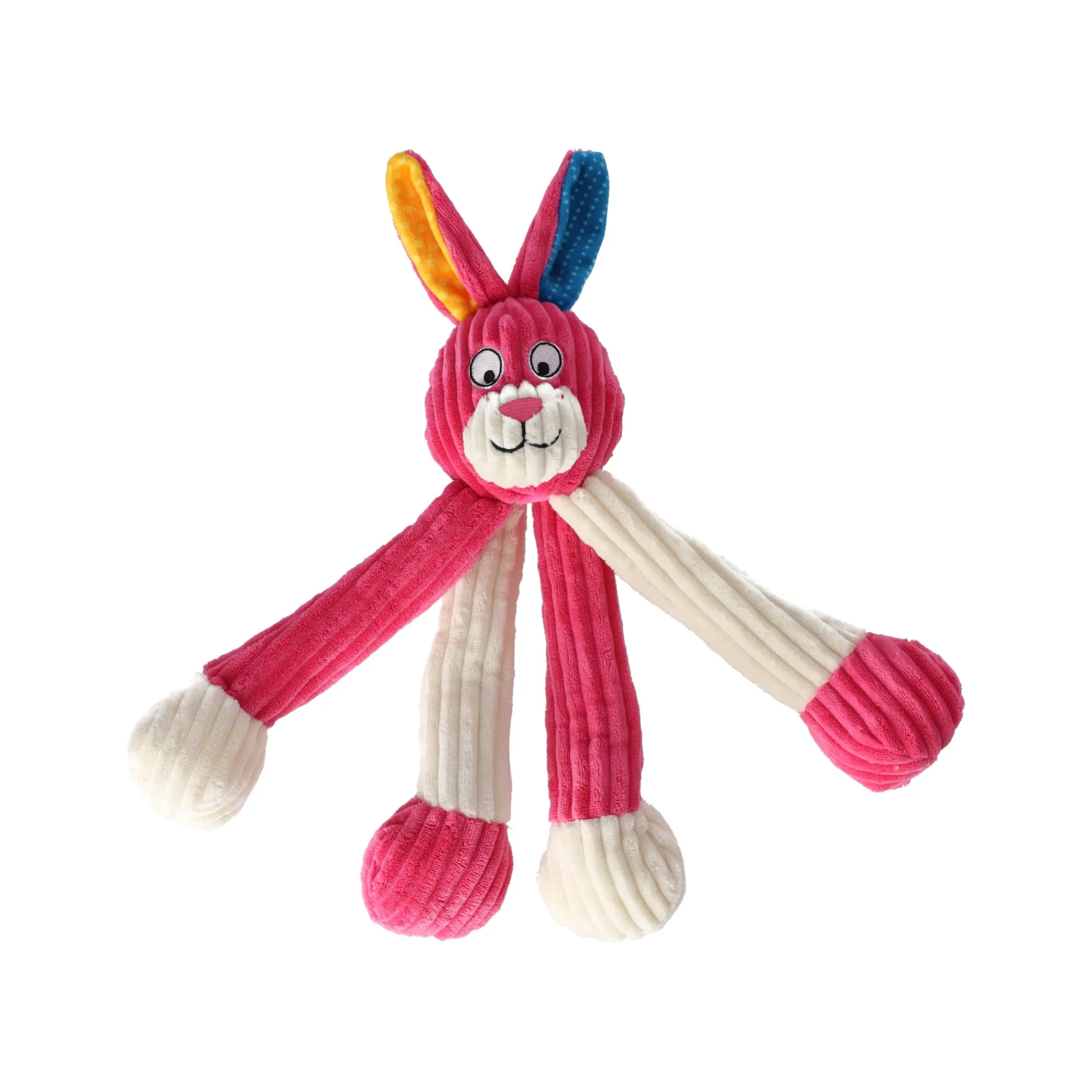 Een lang, knuffelbaar hondenspeeltje in de vorm van een roze konijn, ontworpen voor middelgrote honden. Met afmetingen van 13×37 cm is dit speeltje ideaal voor honden die van knuffelen, dragen en licht kauwen houden.