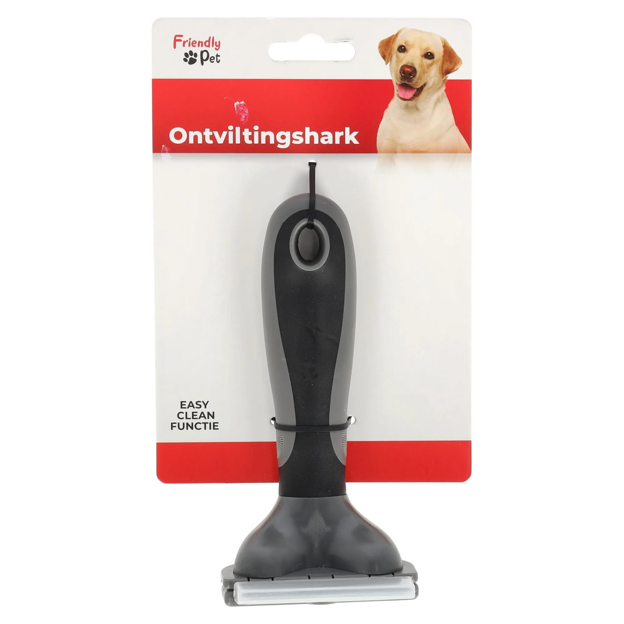 Ontviltingshark voor honden van Friendly Pet, met zwarte handgreep en easy clean functie om losse haren eenvoudig uit de kam te verwijderen.