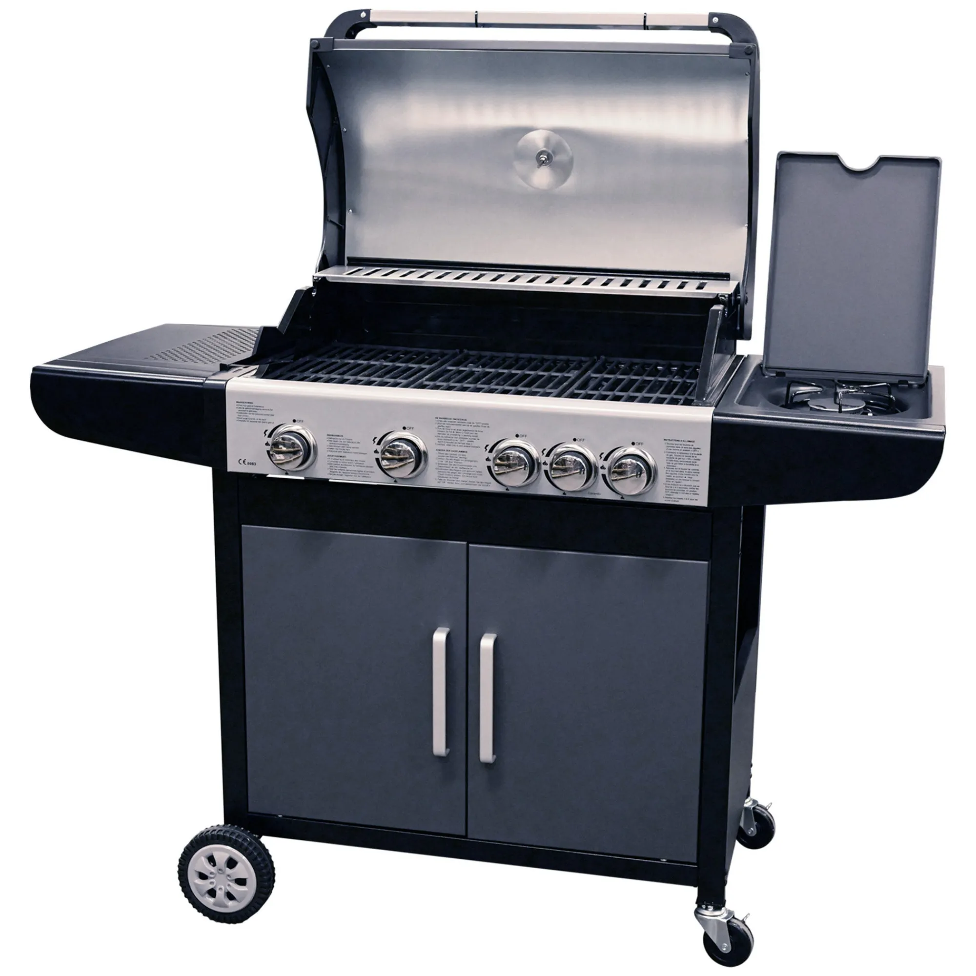 Een gas barbecue warmt veel sneller op dan een houtskoolgrill en dankzij de knoppen en thermometer regel je de grilltemperatuur eenvoudig. Deze gasgrill heeft vier branders en een zijbrander.