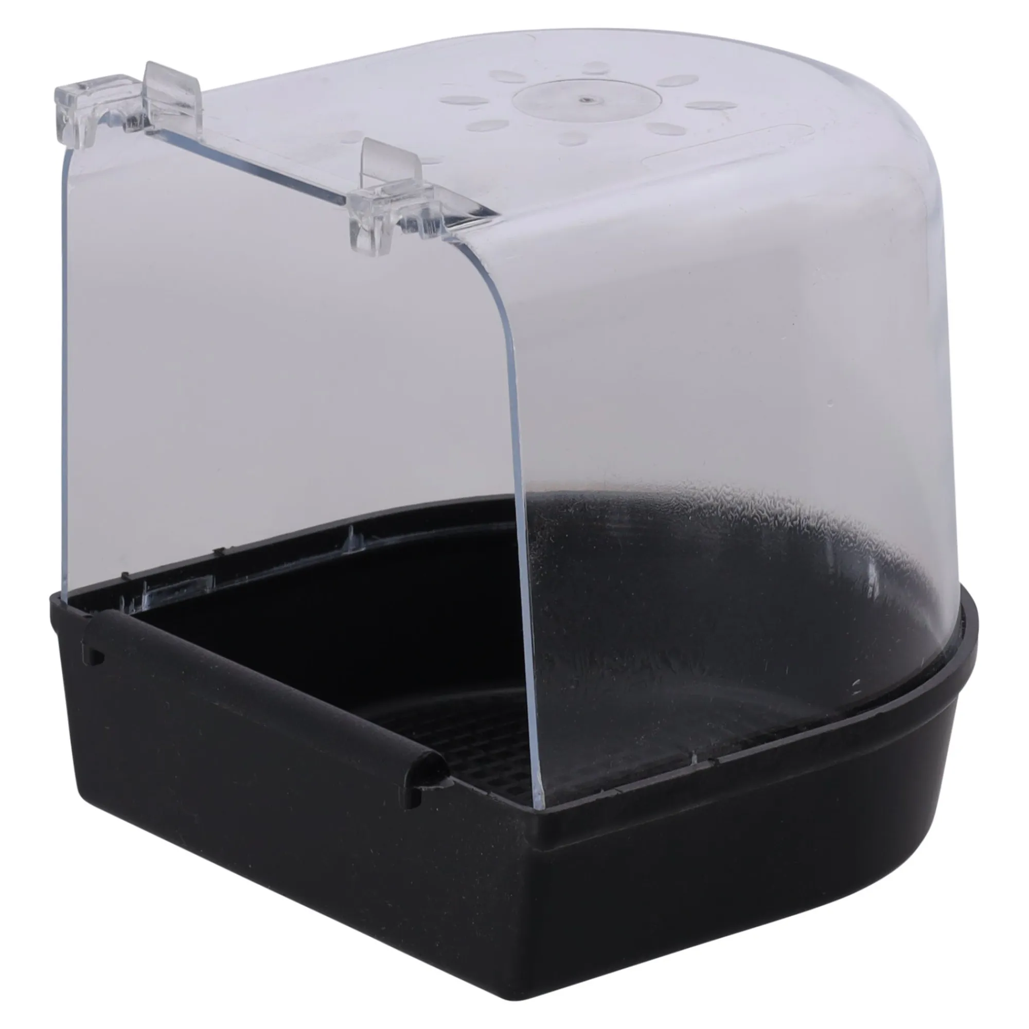 Vogels genieten van een fijn bad! Dit ruime zwarte badhuis voor een rechte kooi biedt volop badplezier. De transparante kap voorkomt spetteren en houdt het water netjes binnen. Het badje is eenvoudig aan de kooi te bevestigen.