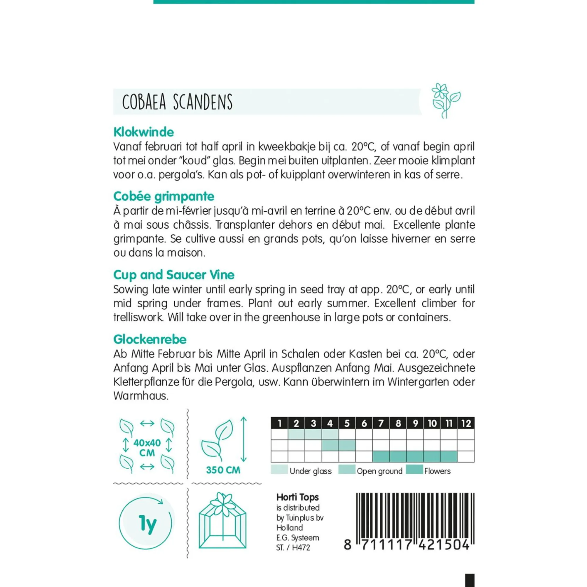 De Cobaea is een snelgroeiende klimplant met grote klokvormige bloemen in paars en wit. Deze sierlijke klokwinde is perfect voor pergola’s, rekken of schuttingen en zorgt voor een weelderige en romantische uitstraling in de tuin.
