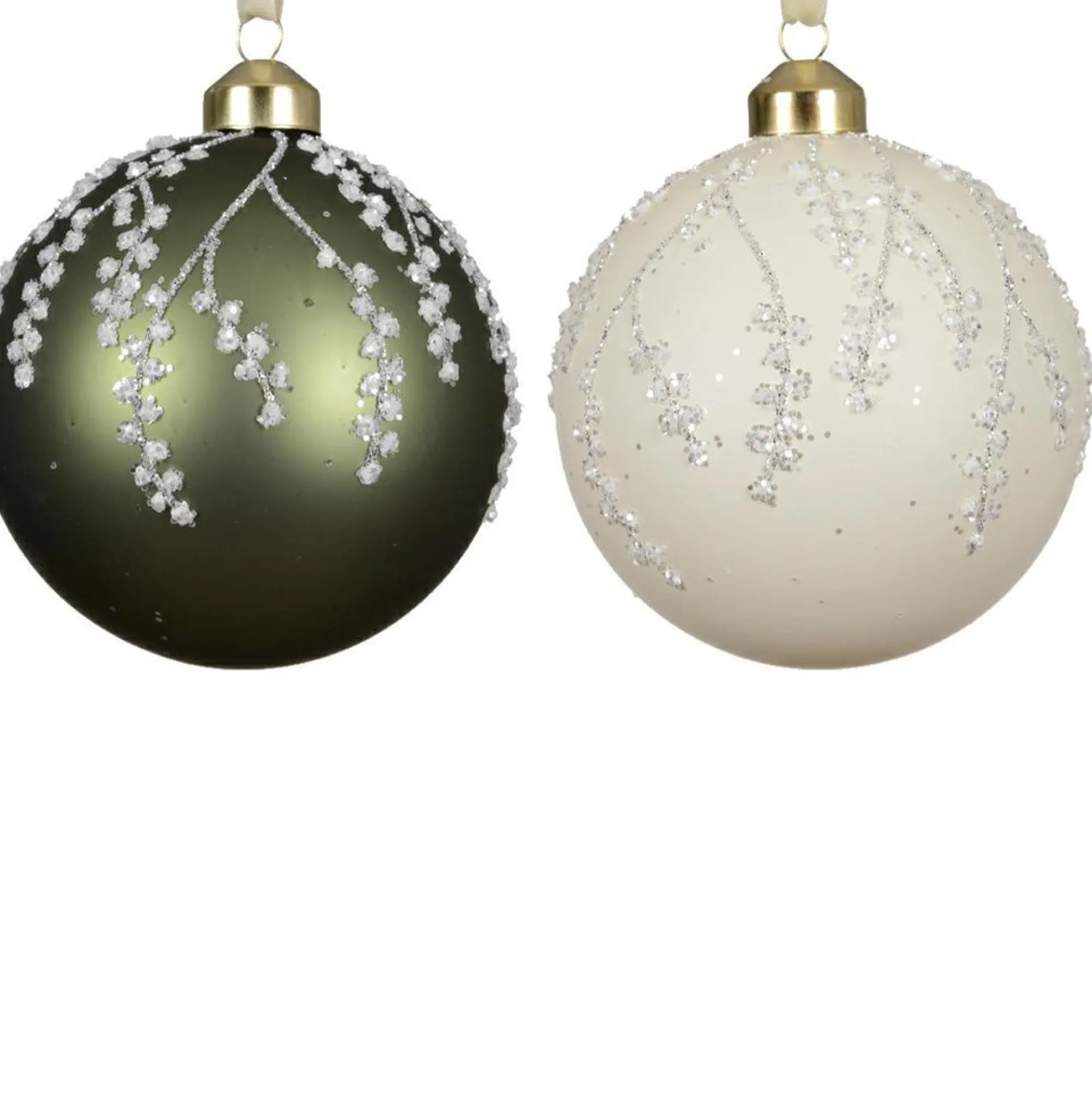Elegante kerstballen met takjesdecor in ijsachtige glitter, verkrijgbaar in twee varianten. De combinatie van matgroen en warm wit met fijne kraaltjes geeft je kerstboom een chique, winterse uitstraling.
