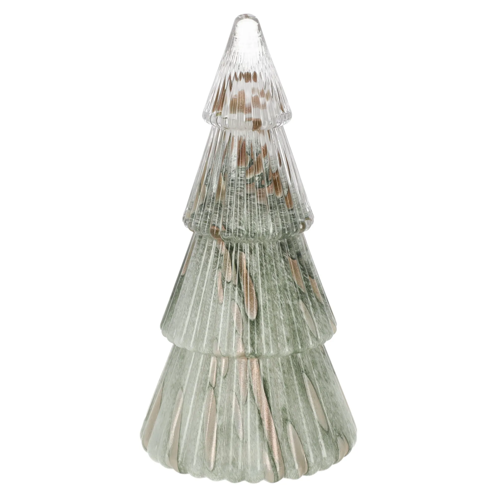 Glazen kerstboom van 30 cm in groen met gelaagde, geribde vorm. Mooi als losse blikvanger op tafel, vensterbank of in een kerststuk.