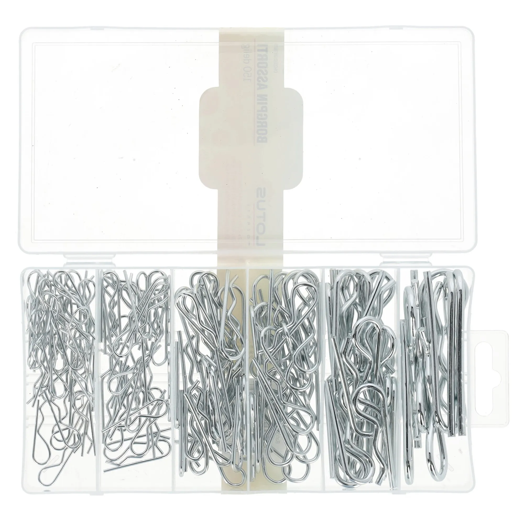 In deze borgpin set van Lotus zitten 150 borgpennen in meerdere maten, overzichtelijk gesorteerd in een transparante opbergdoos met vakverdeling.