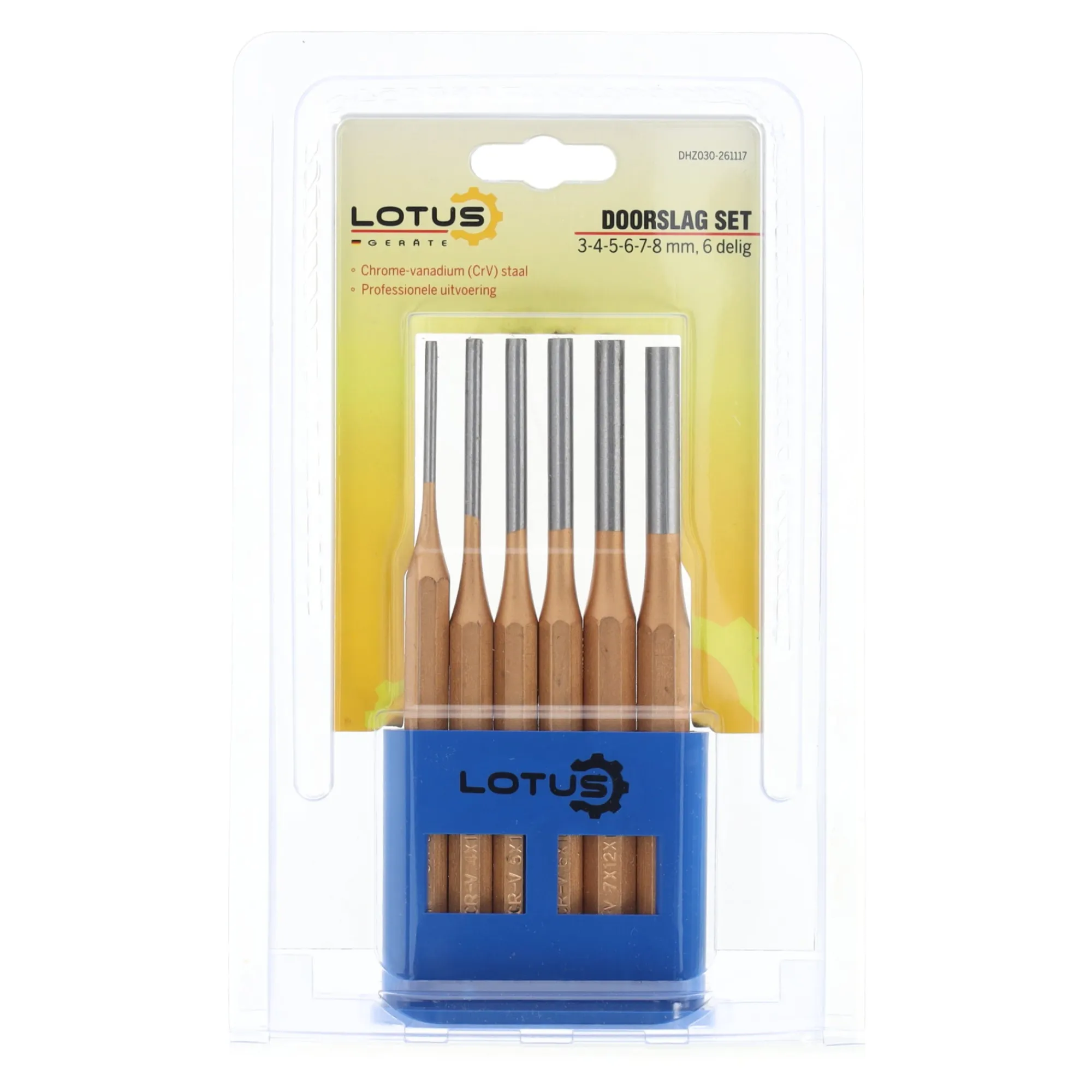 De 6-delige doorslagset van Lotus bevat ponsen van verschillende maten, gemaakt van duurzaam staal. Deze set is ideaal voor het verwijderen van pennen en assen in verschillende mechanismen, en biedt langdurige betrouwbaarheid voor diverse taken.