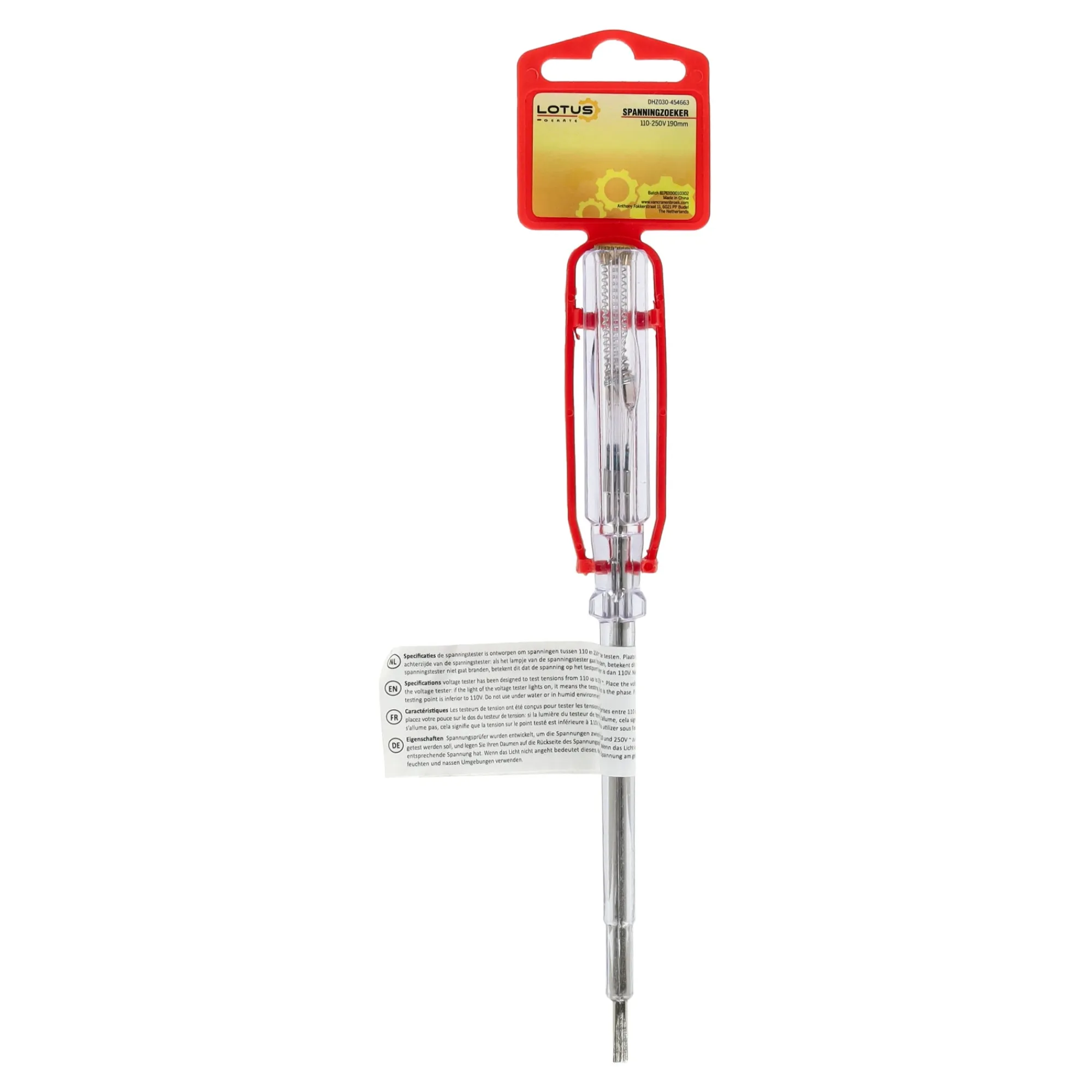 Met een lengte van 190 mm is deze spanningzoeker 100-250V van Lotus uitgevoerd met een transparante handgreep en platte punt, zodat spanning tussen 100 en 250 volt zichtbaar kan worden gecontroleerd.