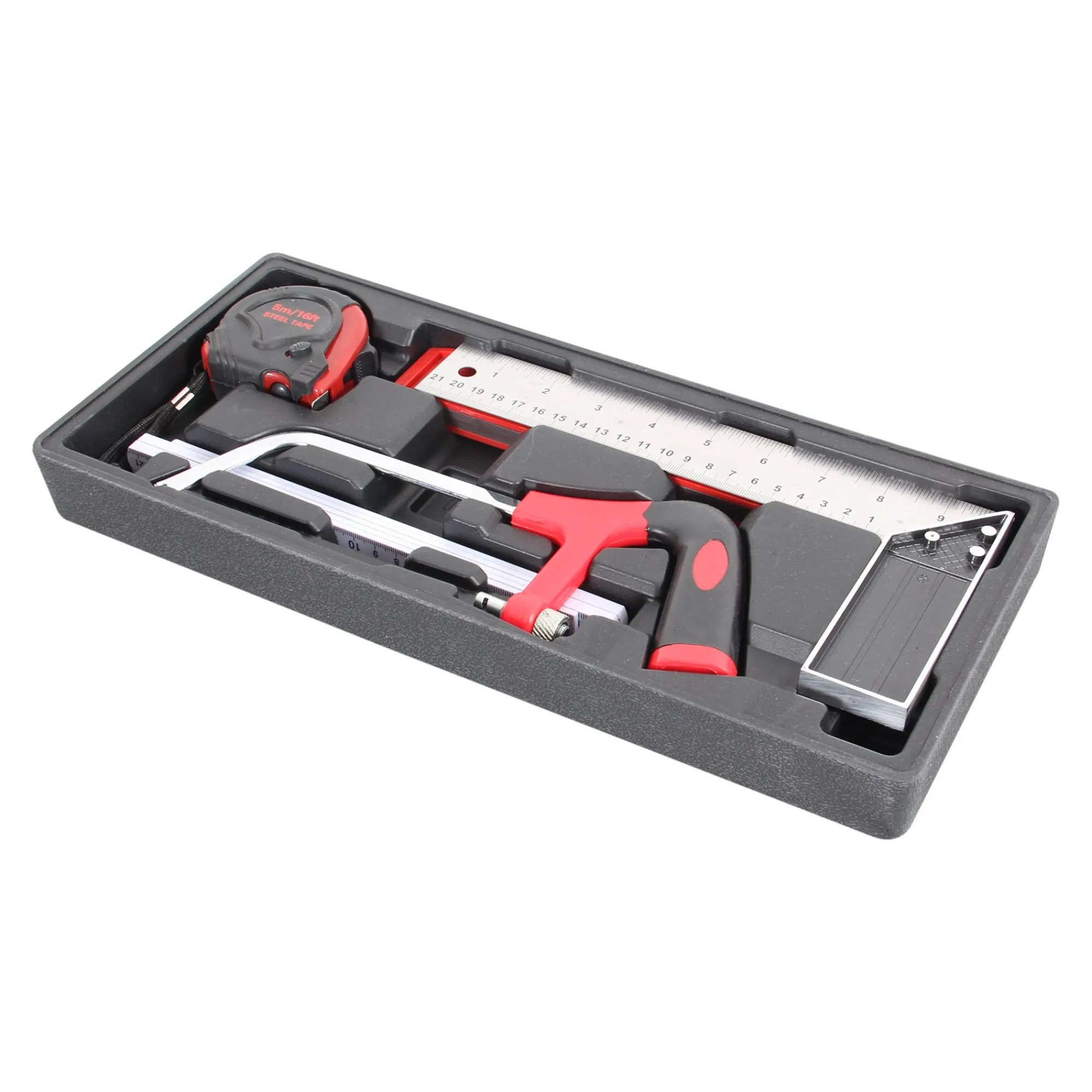 De Meetset 6-delig bevat precisiegereedschap zoals een rolmaat, winkelhaak en waterpas voor nauwkeurige metingen. Geschikt voor constructie, houtbewerking en metaalbewerking.