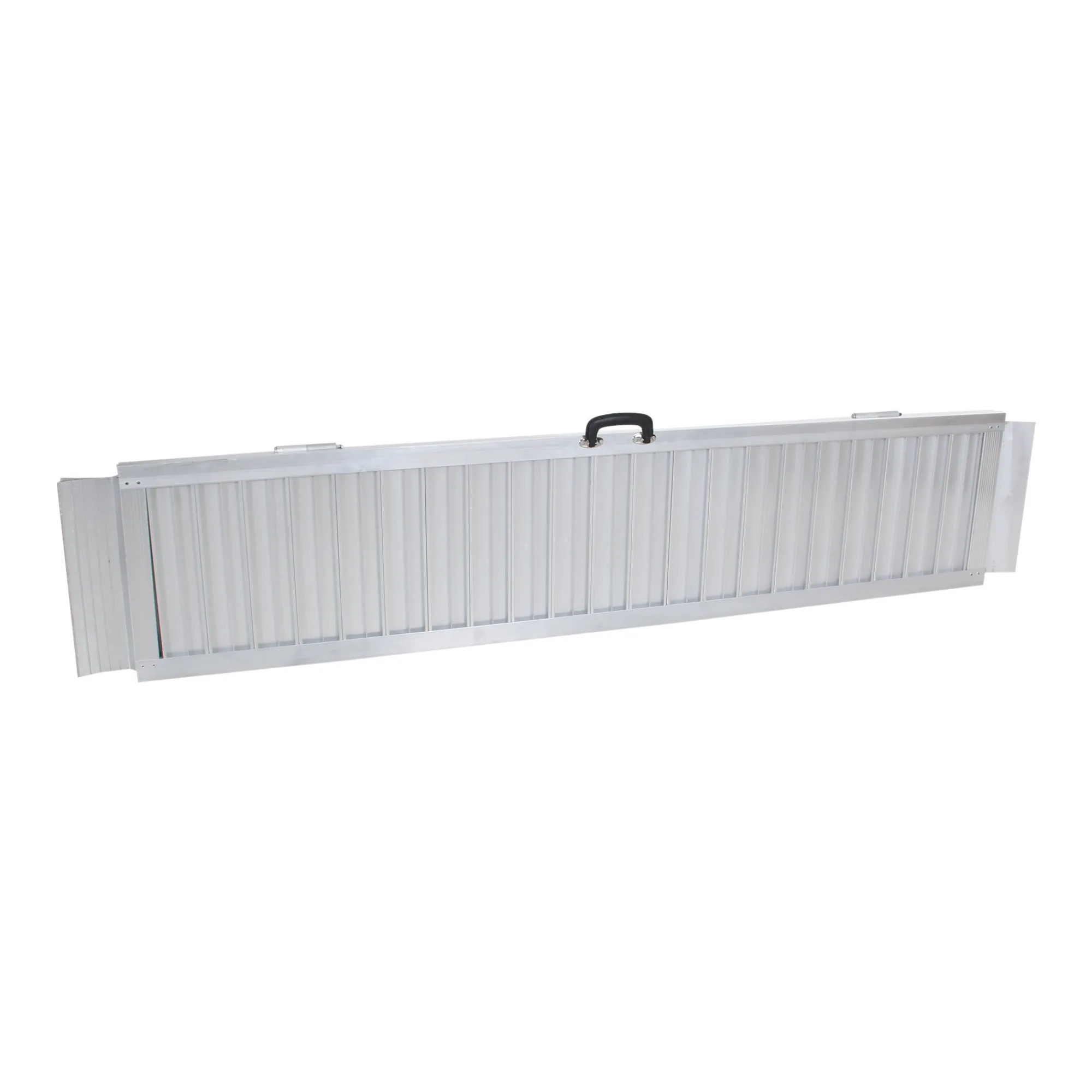 Een inklapbare oprijplaat van 180 x 75 cm. Ideaal voor een scootmobiel, rolstoel of motor. De plaat is voorzien van antislip en een opstaande rand, en is compact op te bergen.