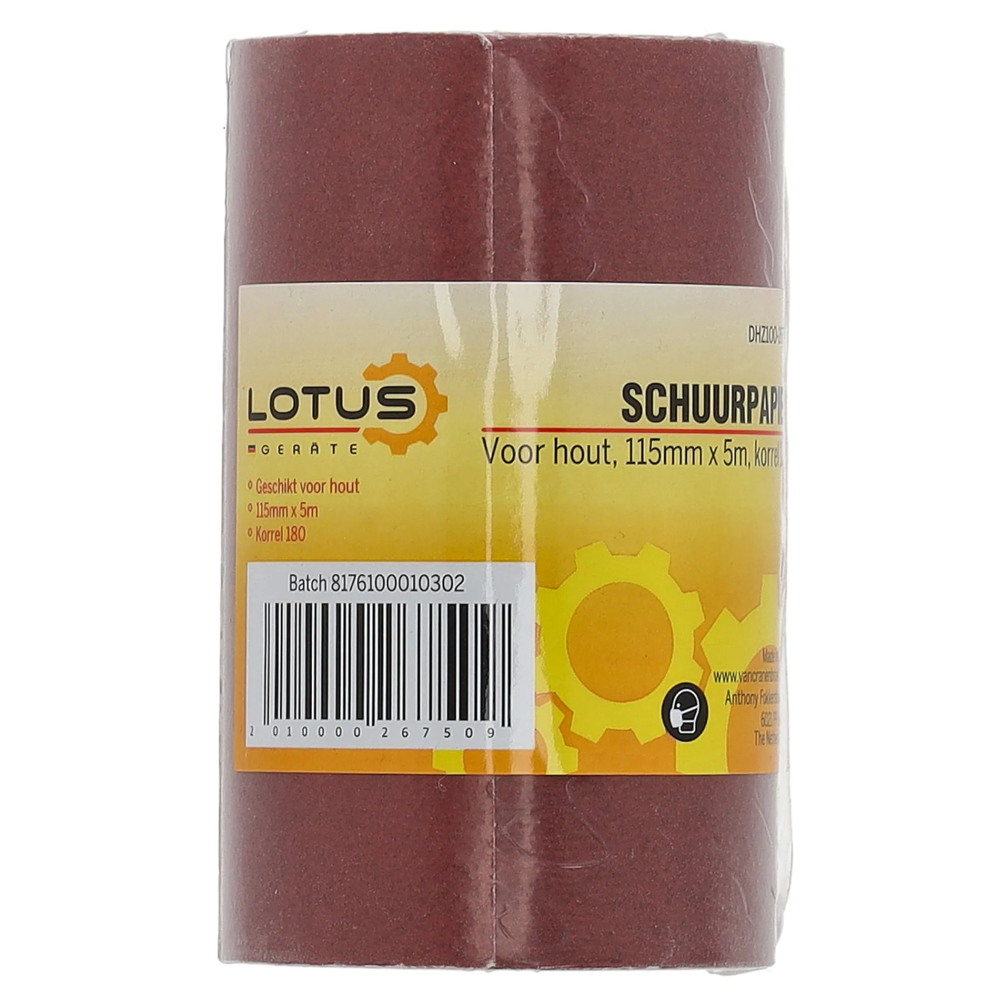 Schuurpapier op rol van Lotus voor hout. De rol is 115 mm breed en 5 meter lang en heeft korrel 180, ideaal voor fijn schuren en het glad afwerken van houten oppervlakken.