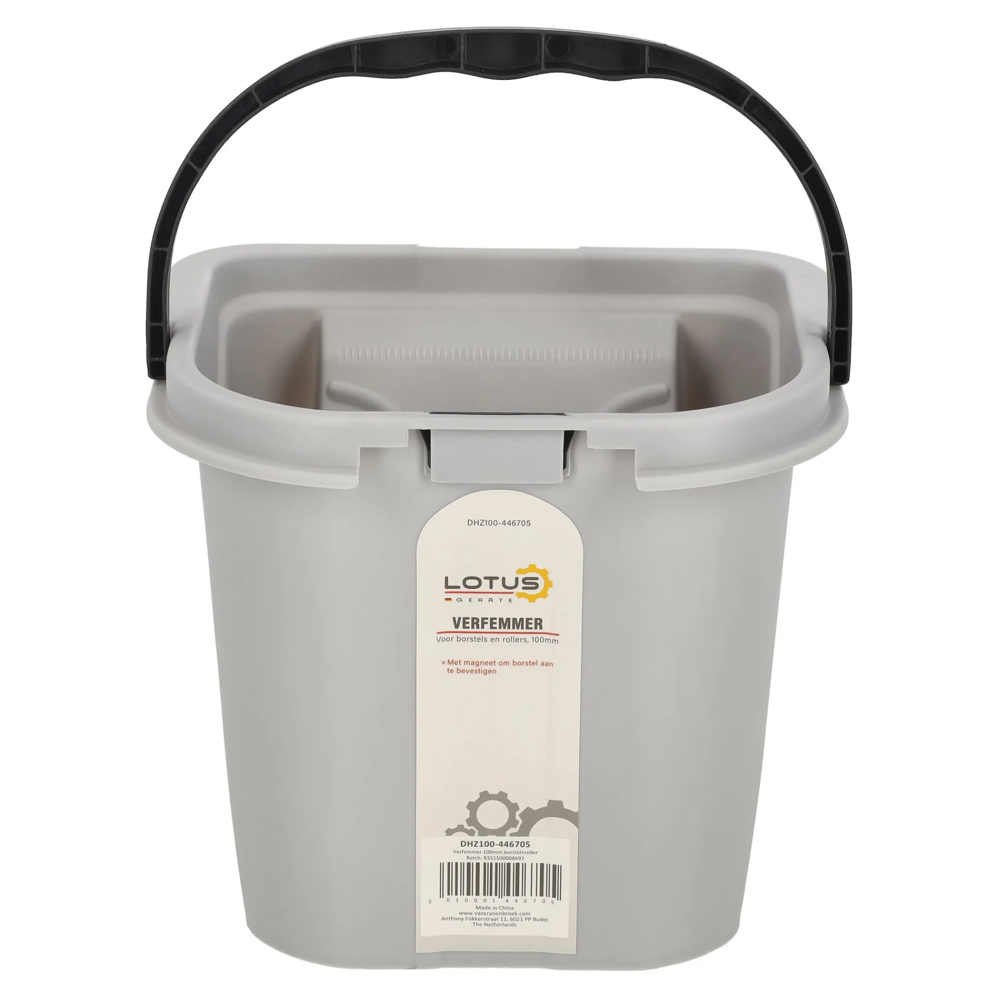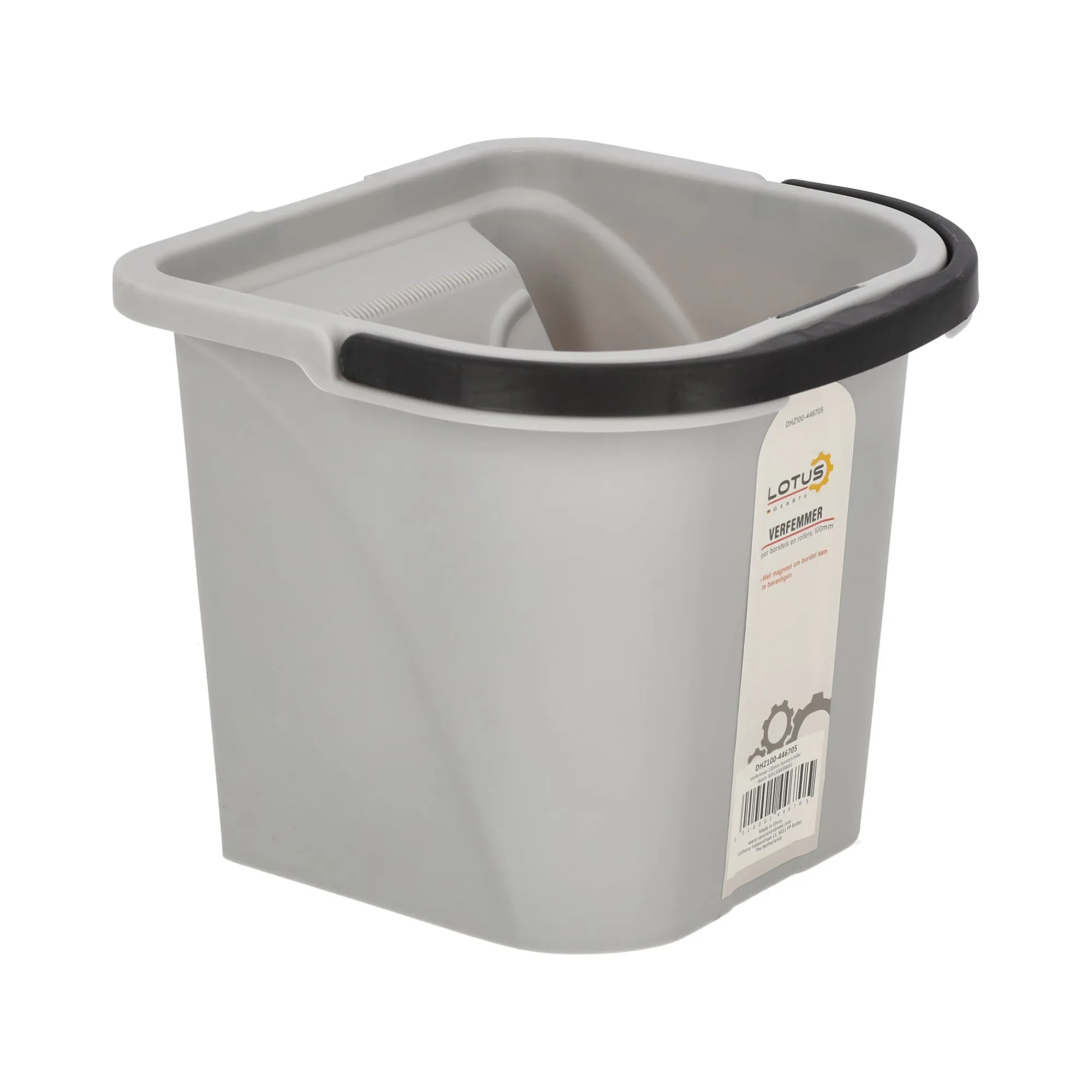 Handige Lotus verfemmer voor kwasten en verfrollers tot 100 mm. Voorzien van een geribbeld afstrijkvlak en een magneet om de kwast tijdelijk vast te zetten tijdens het schilderen.
