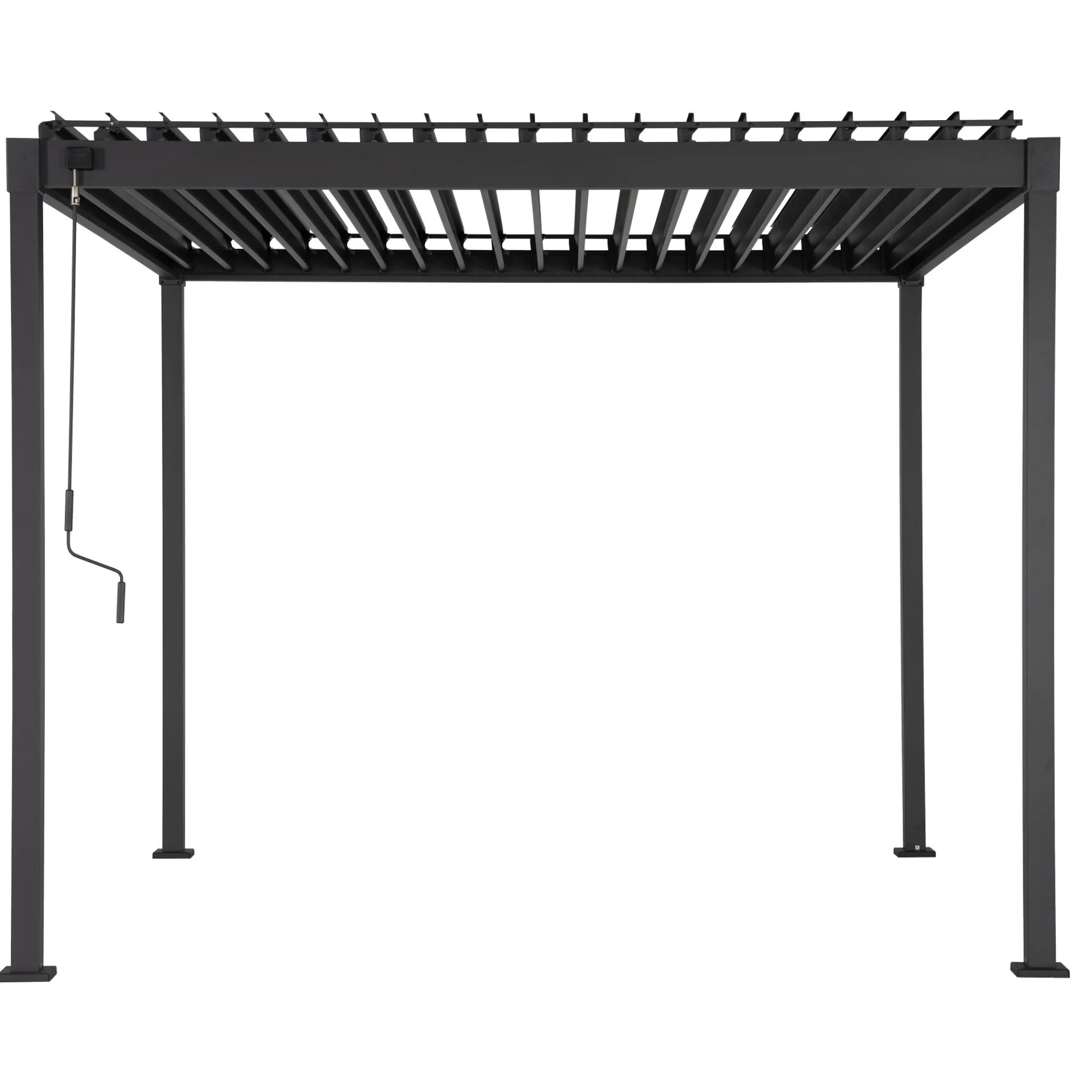 Deze vrijstaande pergola, die ook aan een bestaand gebouw gekoppeld kan worden, is de ideale uitbreiding van uw woonruimte. Met het lamellendak kunt u eenvoudig inspelen op veranderend weer. U bepaalt zelf de hoeveelheid zonlicht en ventilatie door de lamellen te verstellen.