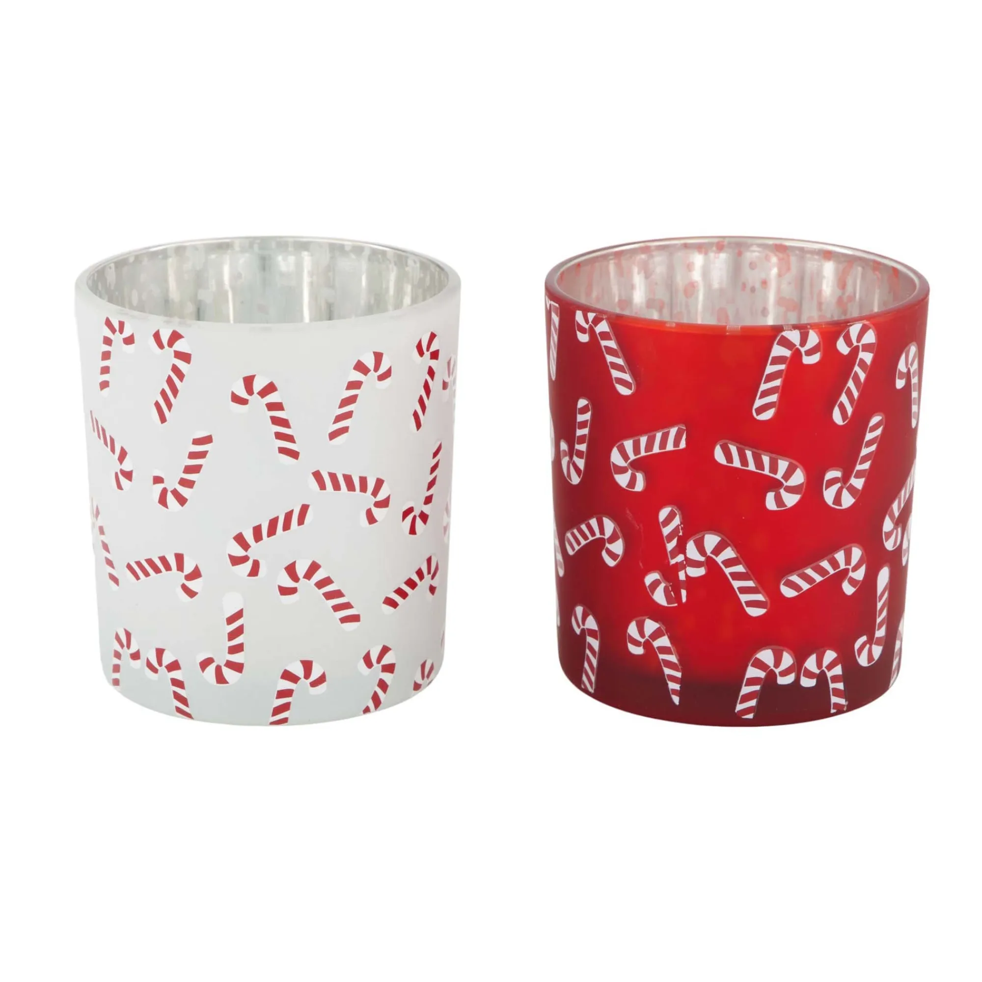 Glazen theelichthouder met decoratief snoepstokmotief, verkrijgbaar in twee uitvoeringen.