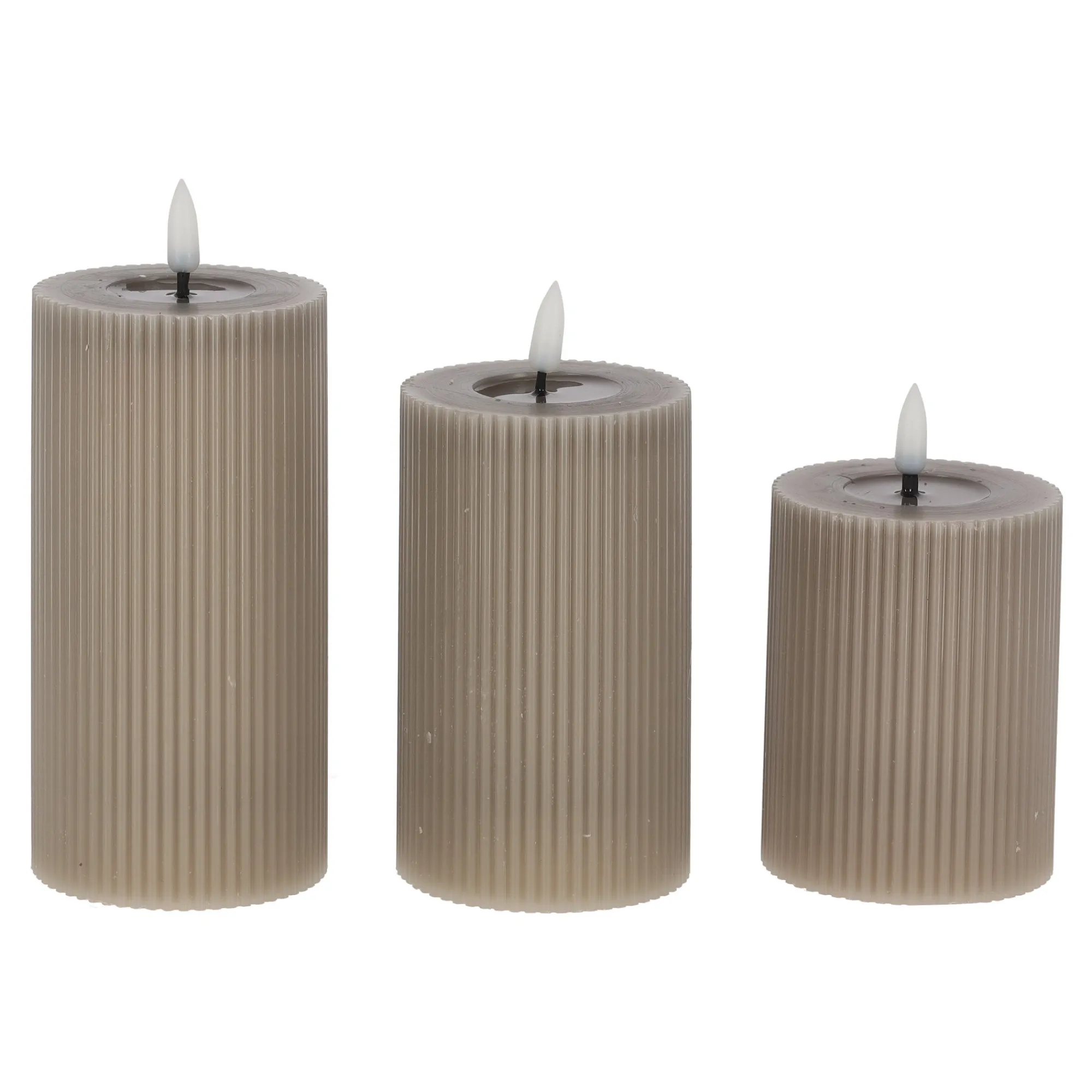 Set van drie LED-kaarsen met ribbelstructuur en ‘melted’ effect. Inclusief afstandsbediening voor eenvoudig gebruik en een warme, sfeervolle gloed.