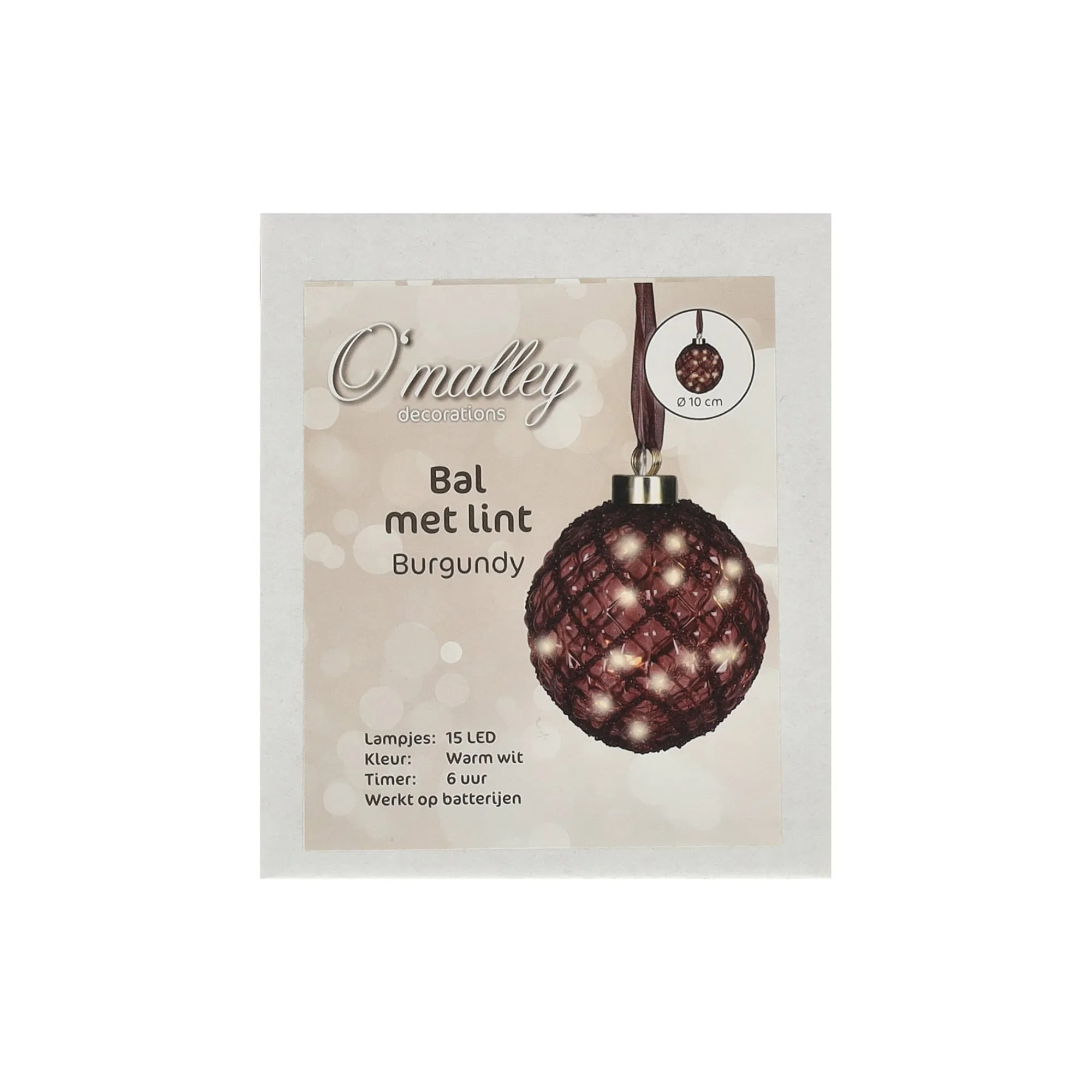 O’malley Kerstballen>Bal met lint burgundy 10 cm 15 LED-warm wit