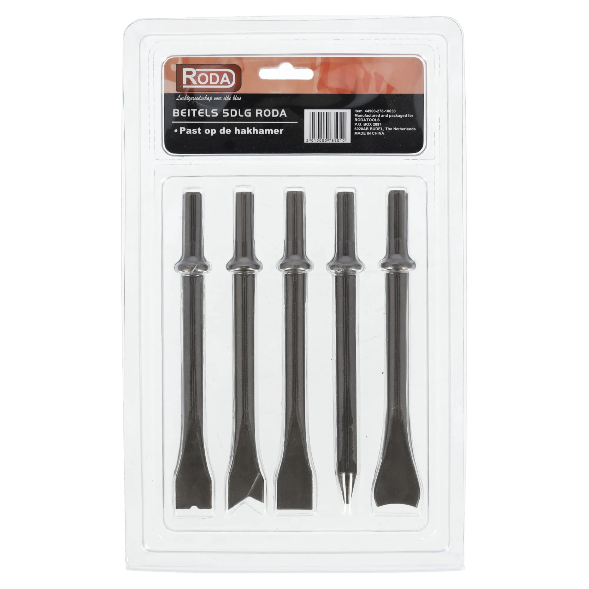 Set van 5 beitels van Roda, passend op de hakhamer, geschikt voor uiteenlopende breek- en hakwerkzaamheden.