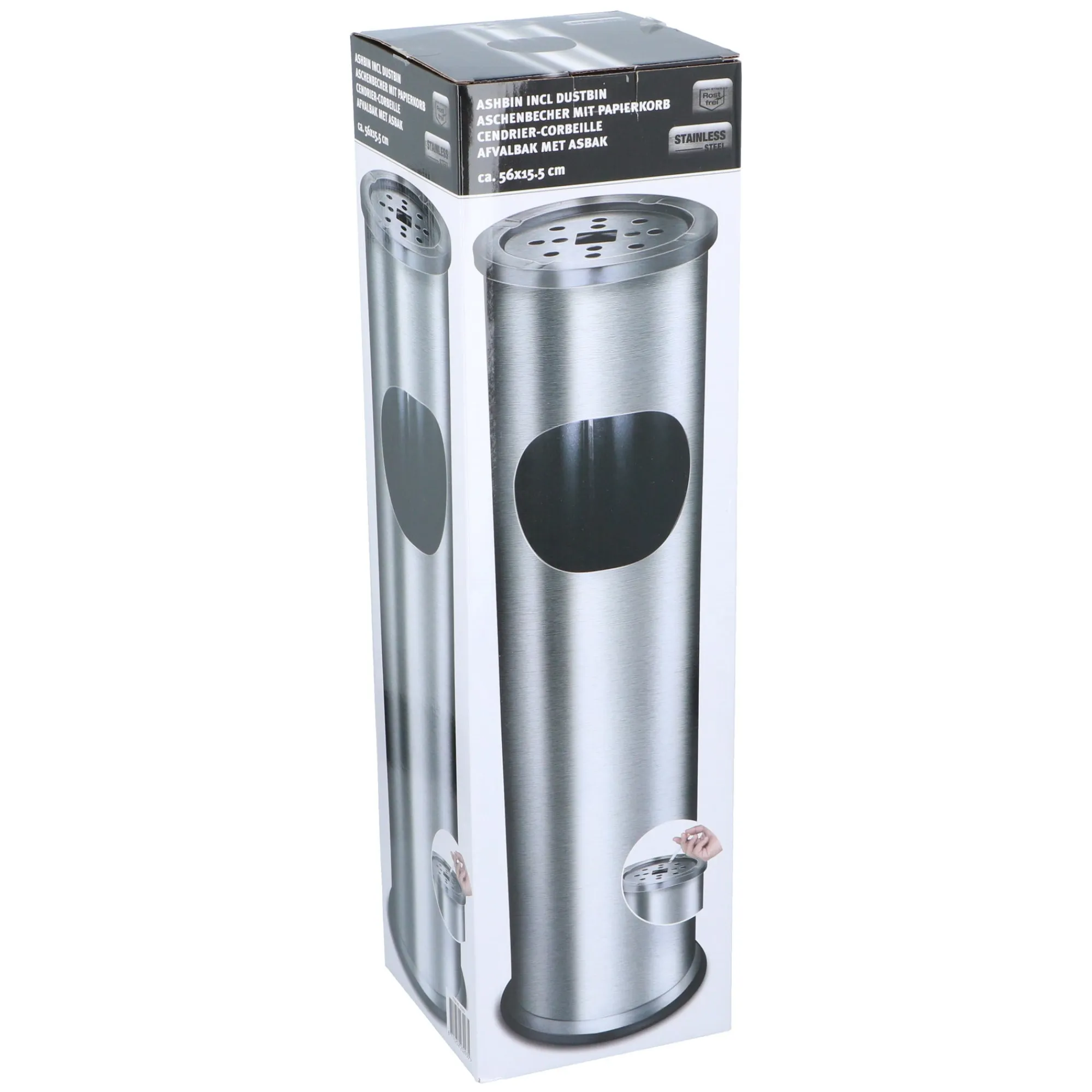 Afvalbak met geïntegreerde asbak, geschikt voor binnen- en buitengebruik. Praktische oplossing voor het schoonhouden van rook- en openbare ruimtes.