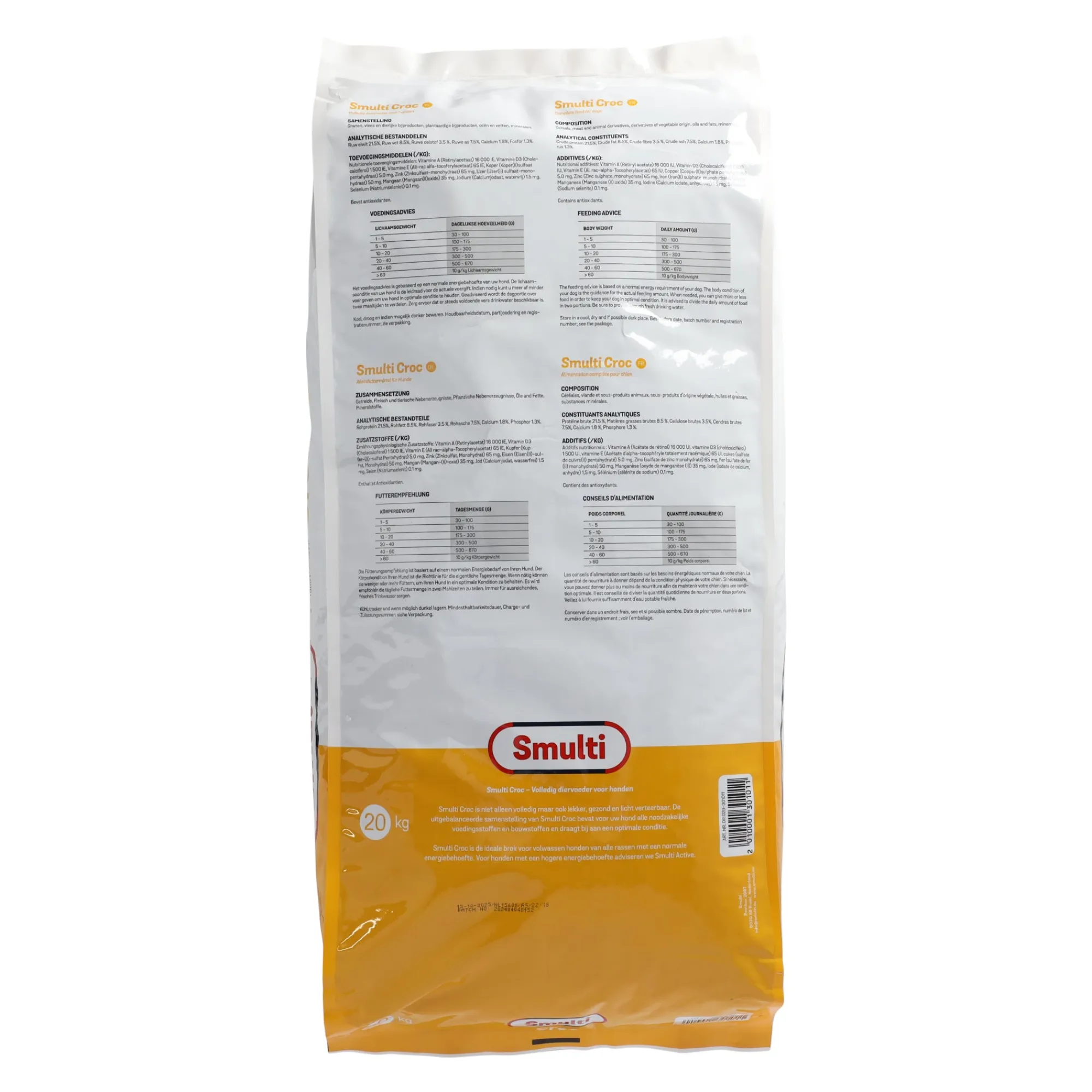 Smulti Croc is een complete, smakelijke, gezonde en licht verteerbare voeding. De uitgebalanceerde samenstelling van Smulti Croc bevat alle noodzakelijke voedings- en bouwstoffen voor uw hond en draagt bij aan een goede conditie. Smulti Croc is geschikt voor volwassen honden van alle rassen met een normale energiebehoefte. Voor honden met een hogere energiebehoefte adviseren we Smulti Active.