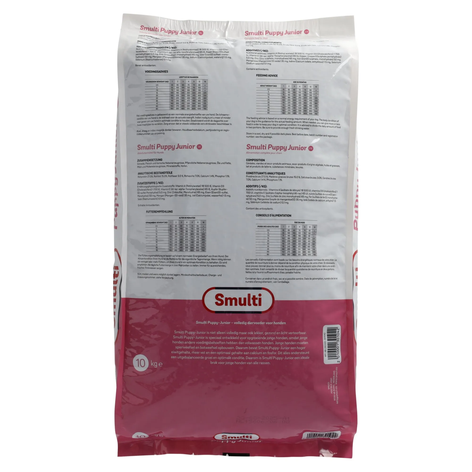 Smulti Puppy-Junior is een complete, smakelijke en licht verteerbare voeding. Speciaal ontwikkeld voor opgroeiende jonge honden, die andere voedingsbehoeften hebben dan volwassen honden. Jonge honden hebben extra bouwstoffen nodig voor de ontwikkeling van spieren en botten. Smulti Puppy-Junior bevat daarom een hoger eiwitgehalte, meer vet en een optimale hoeveelheid calcium en fosfor. Dit ondersteunt een evenwichtige groei en een goede conditie. Smulti Puppy-Junior is geschikt voor jonge honden van alle rassen.