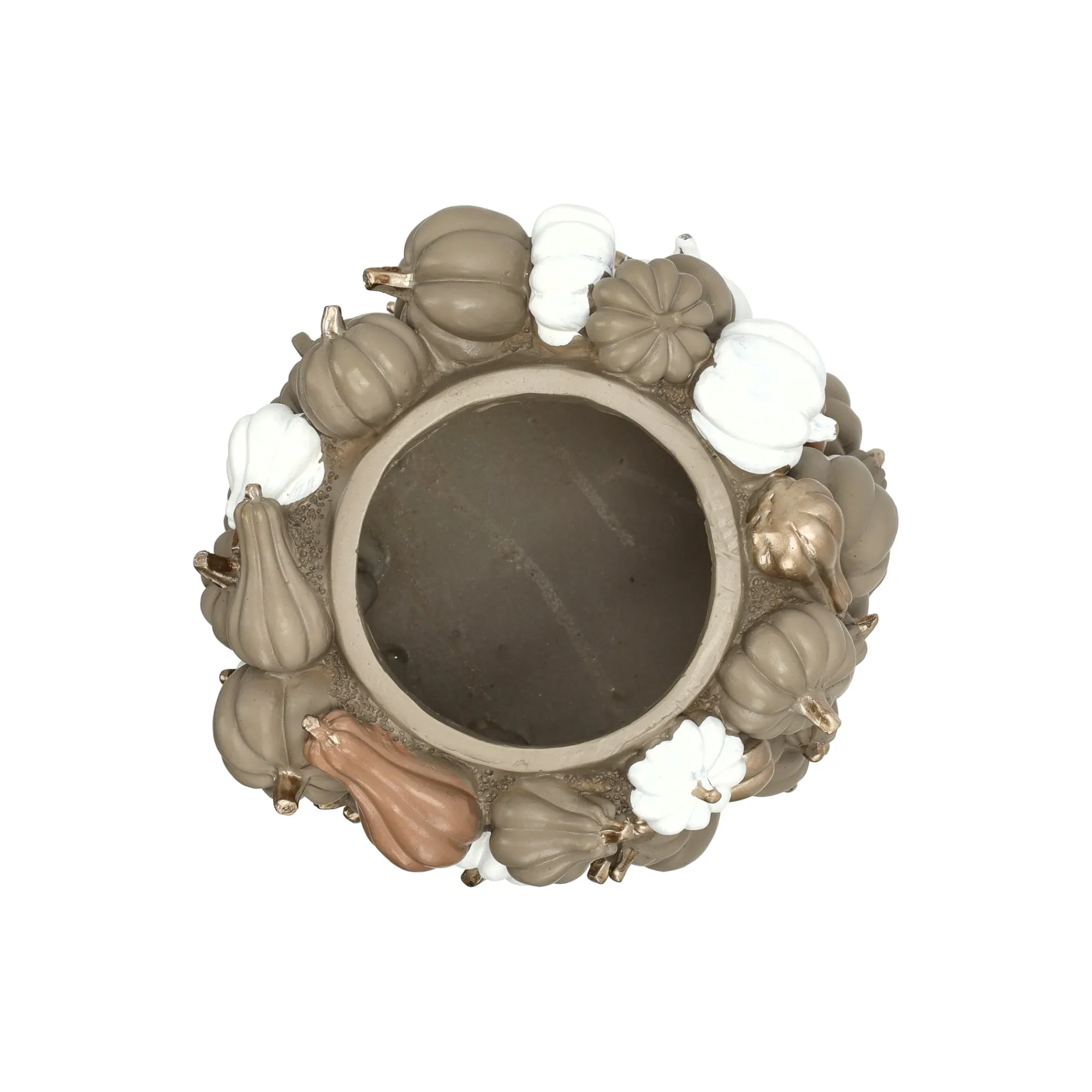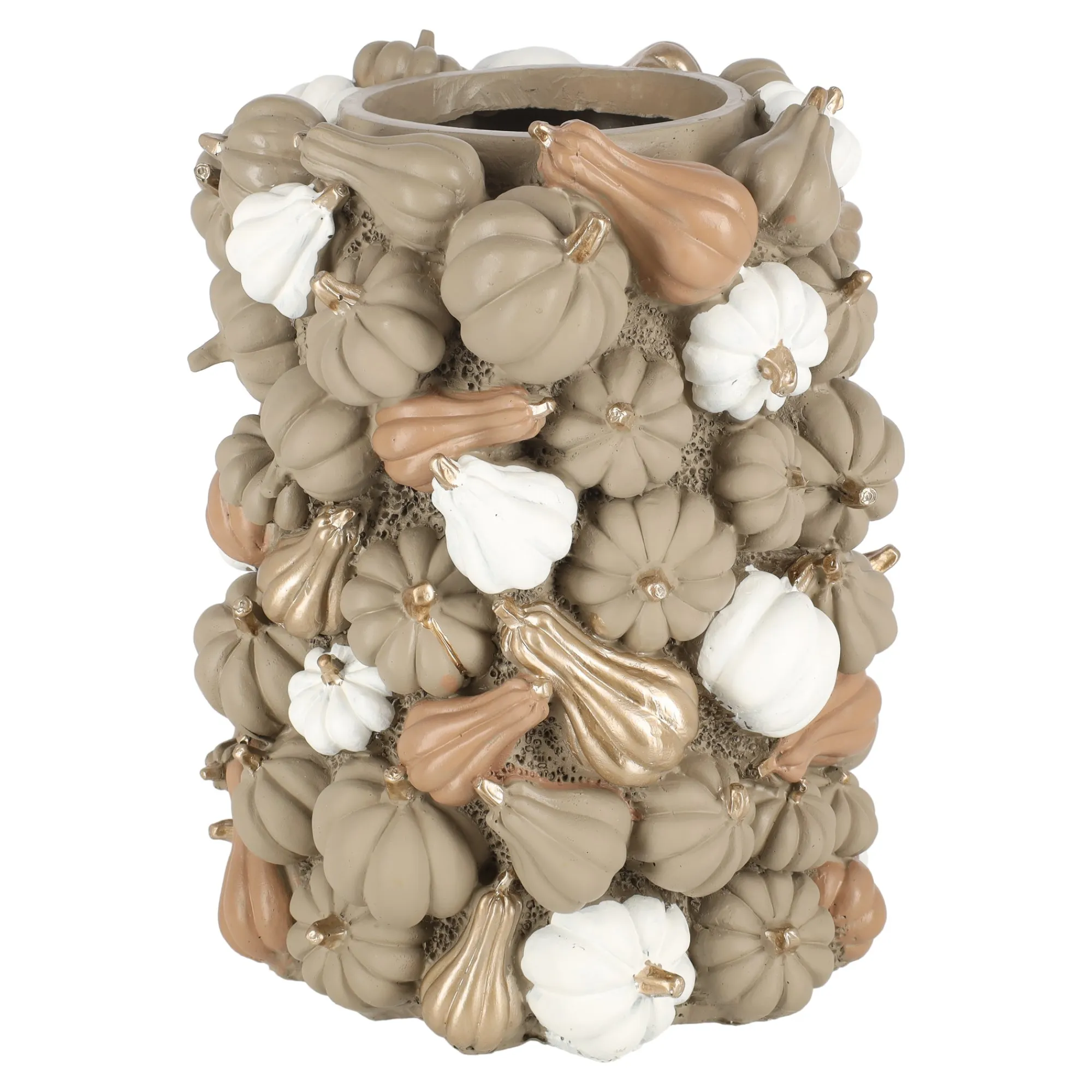 Deze bijzondere vaas is versierd met talloze kleine pompoentjes in warme tinten beige, wit en goud. De speelse vormen en glanzende accenten geven de vaas een gezellige, herfstige uitstraling. Perfect om een paar takken of droogbloemen in te zetten, maar ook zonder inhoud een echte blikvanger op tafel of in de vensterbank.