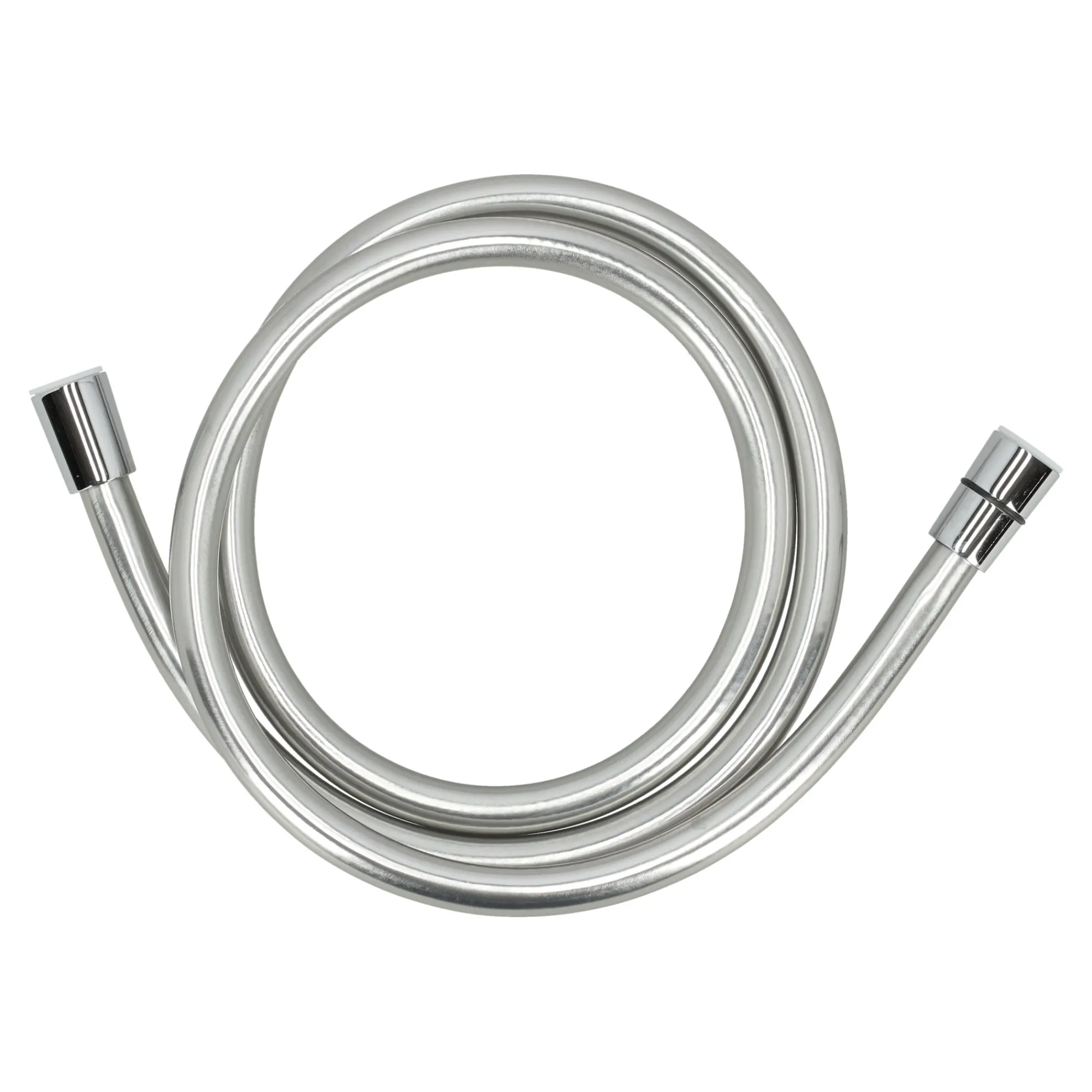 Een stevige zilverkleurige doucheslang met kunststof binnenslang en metalen omhulsel. Uitgerust met robuuste koppelingen en passend op standaard douchekranen en -koppen. Geschikt voor dagelijks gebruik.
