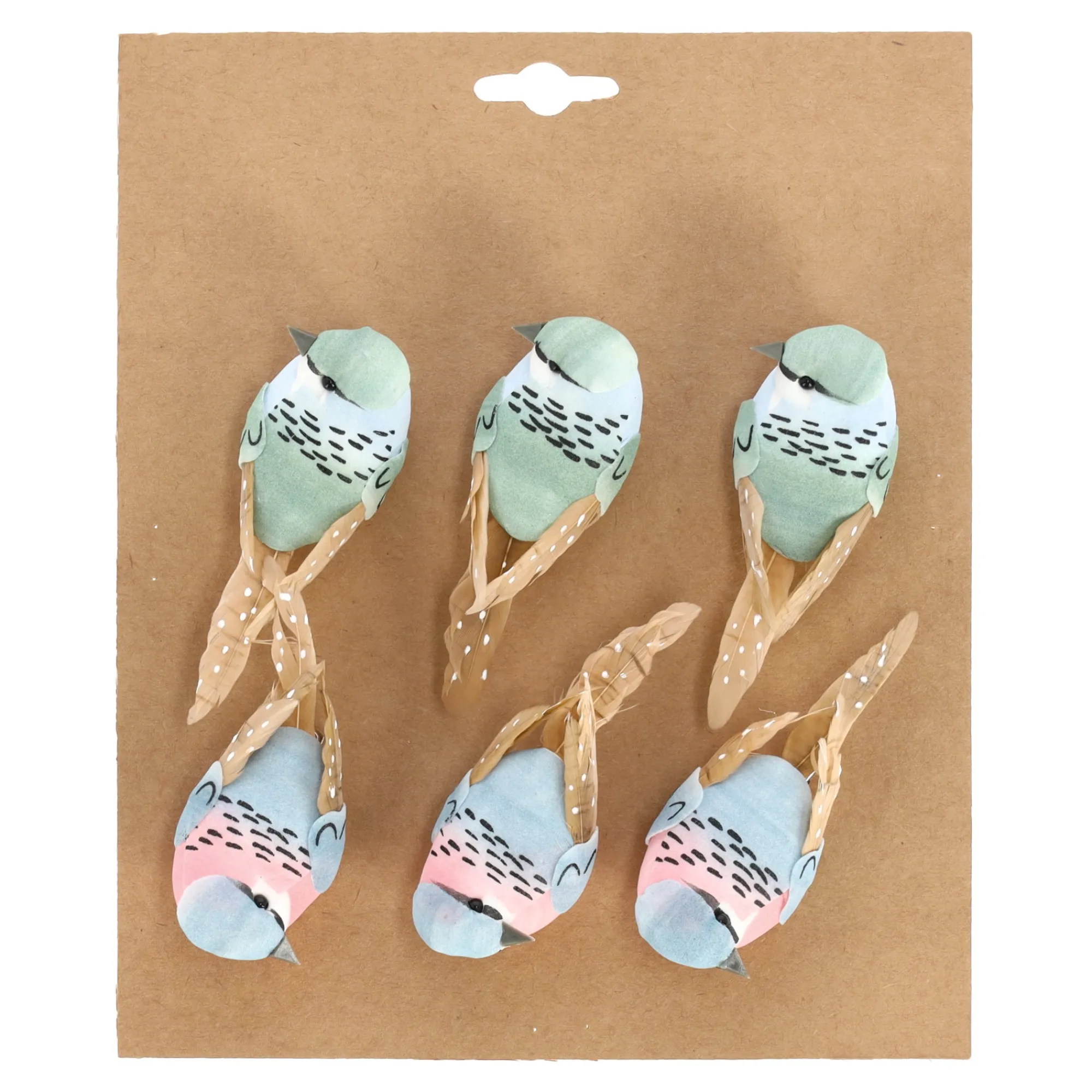 Deze set van 6 decoratieve vogels op clip komt in groen, blauw en roze tinten. De vogeltjes zijn afgewerkt met echte veertjes en voorzien van een metalen clip, zodat je ze eenvoudig kunt bevestigen in de kerstboom, een krans of een ander kerststuk.