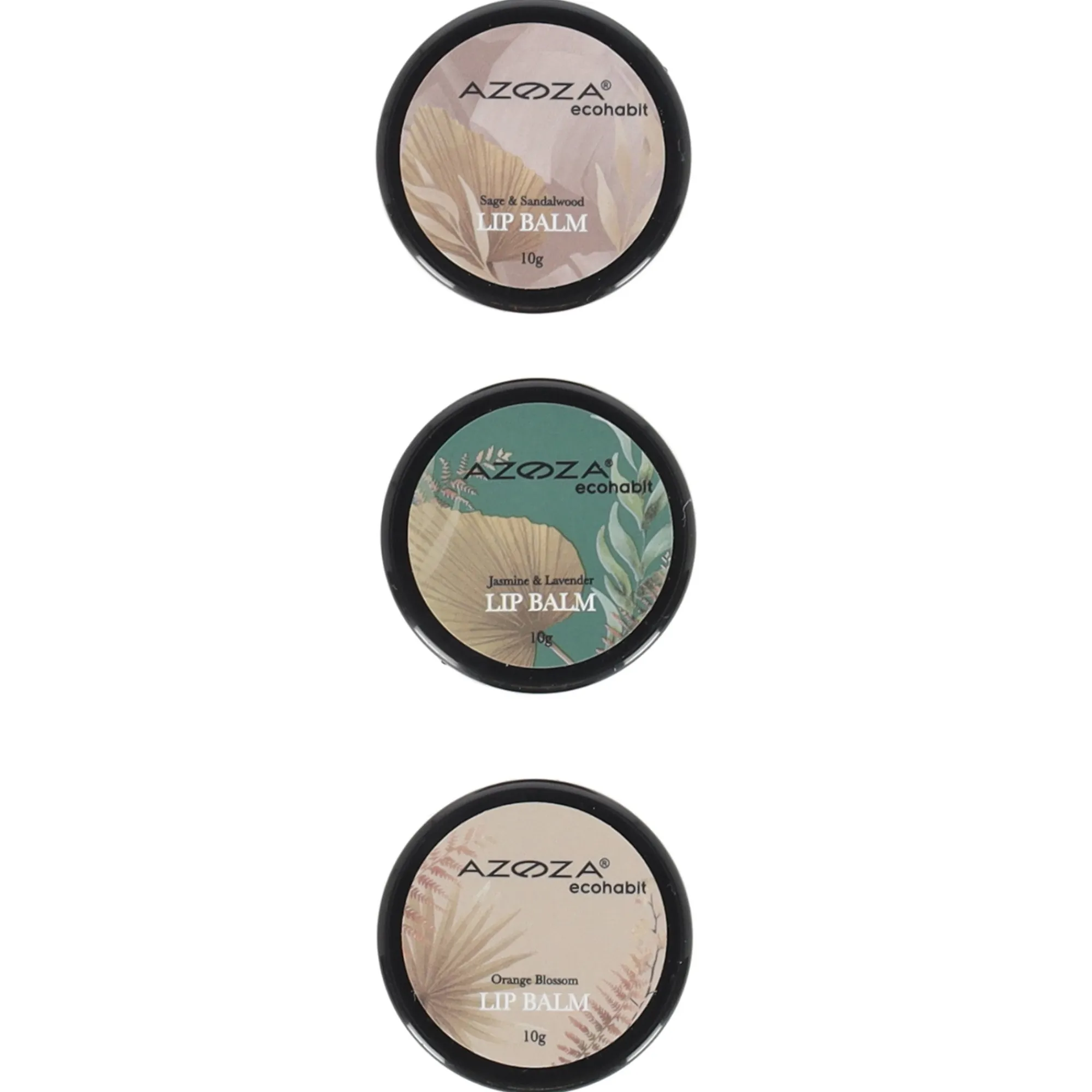 Een biologische lipbalsemset van Azoza met drie varianten (oranje bloesem, jasmijn & lavendel, salie & sandelhout). De balsems zijn parabenvrij, eco-vriendelijk, veganistisch en dierproefvrij. De set bevat drie potjes van 10 g.