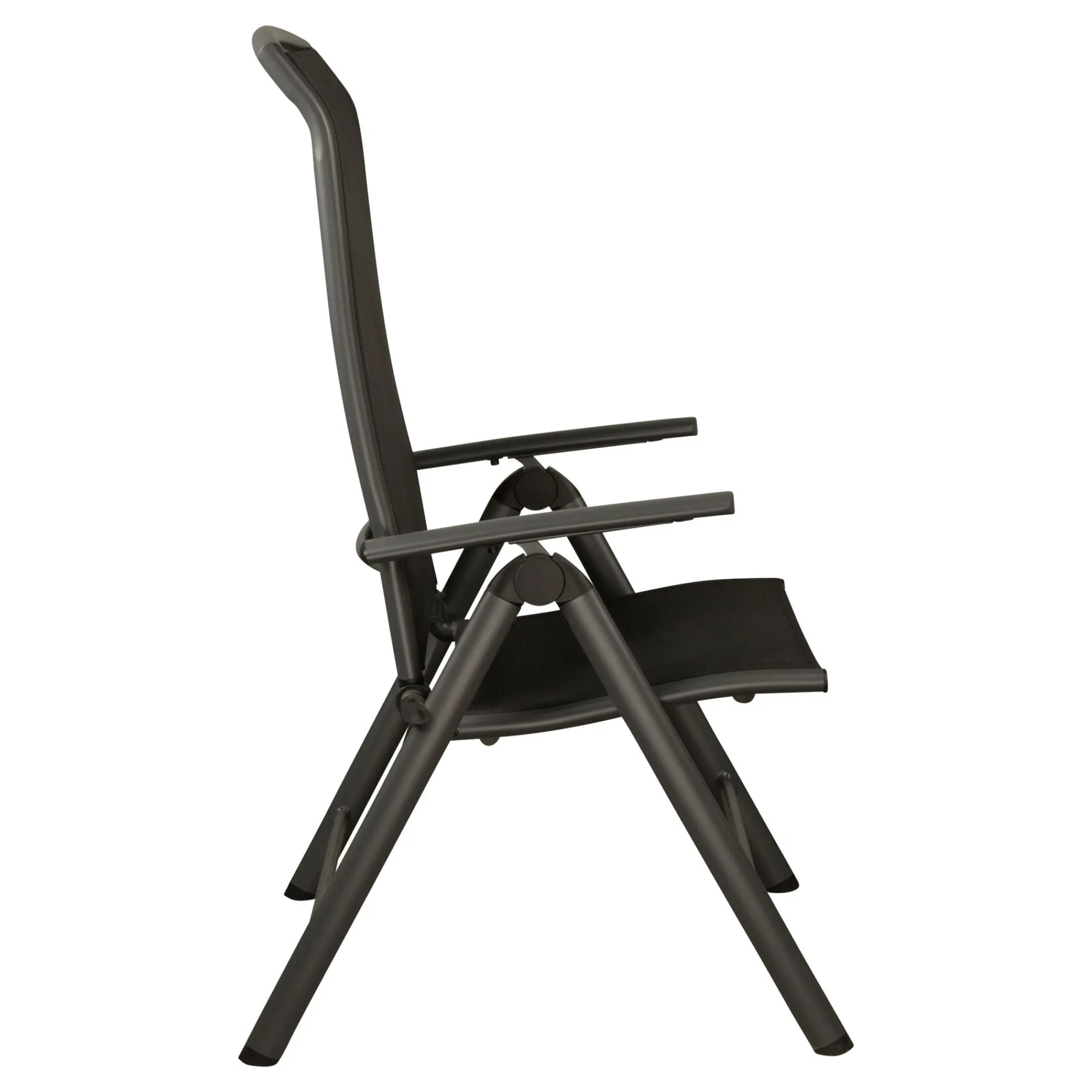 De stoel in antraciet met zwart textileen combineert stijl en comfort en is geschikt voor zowel binnen als buiten. Het aluminium frame is licht en roestvrij, en de rugleuning is verstelbaar in 8 standen voor optimaal zitgemak.