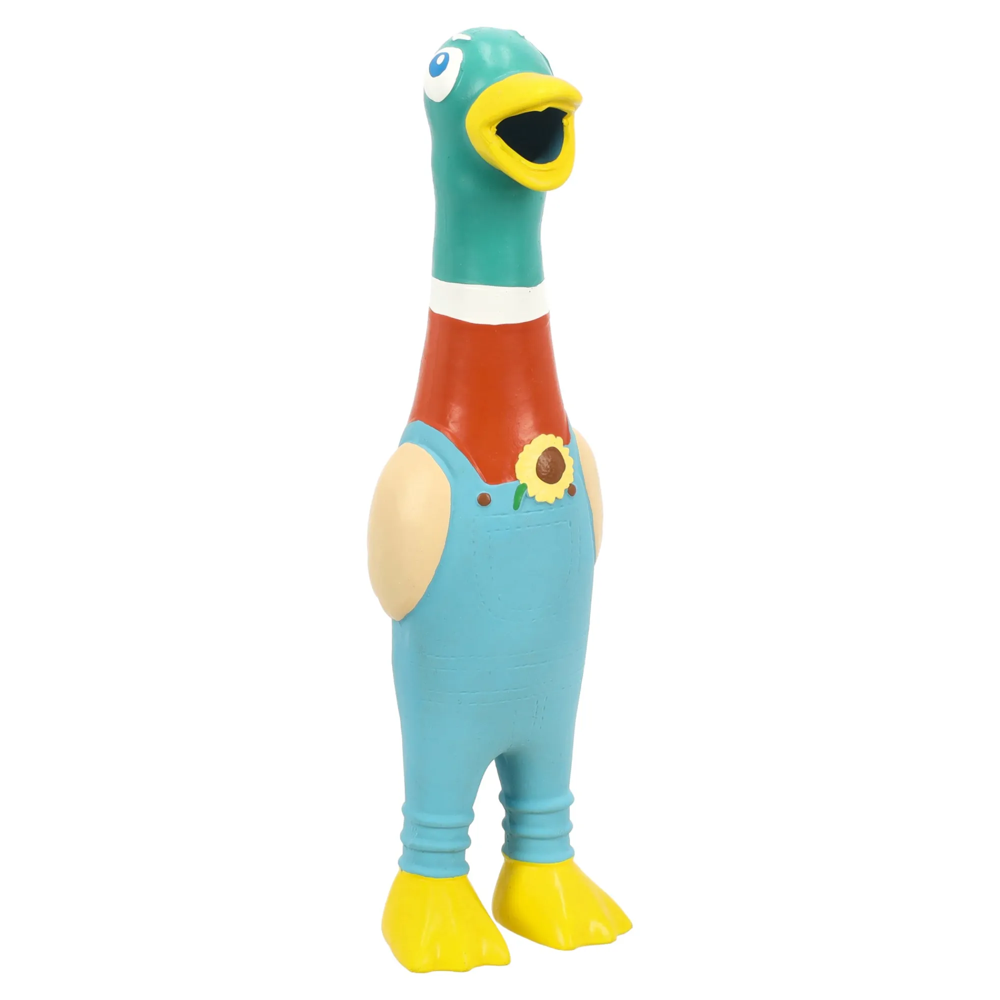 Vrolijk hondenspeeltje in de vorm van een eend met blauwe tuinbroek, gemaakt van stevig rubber en perfect om mee te kauwen en te spelen.