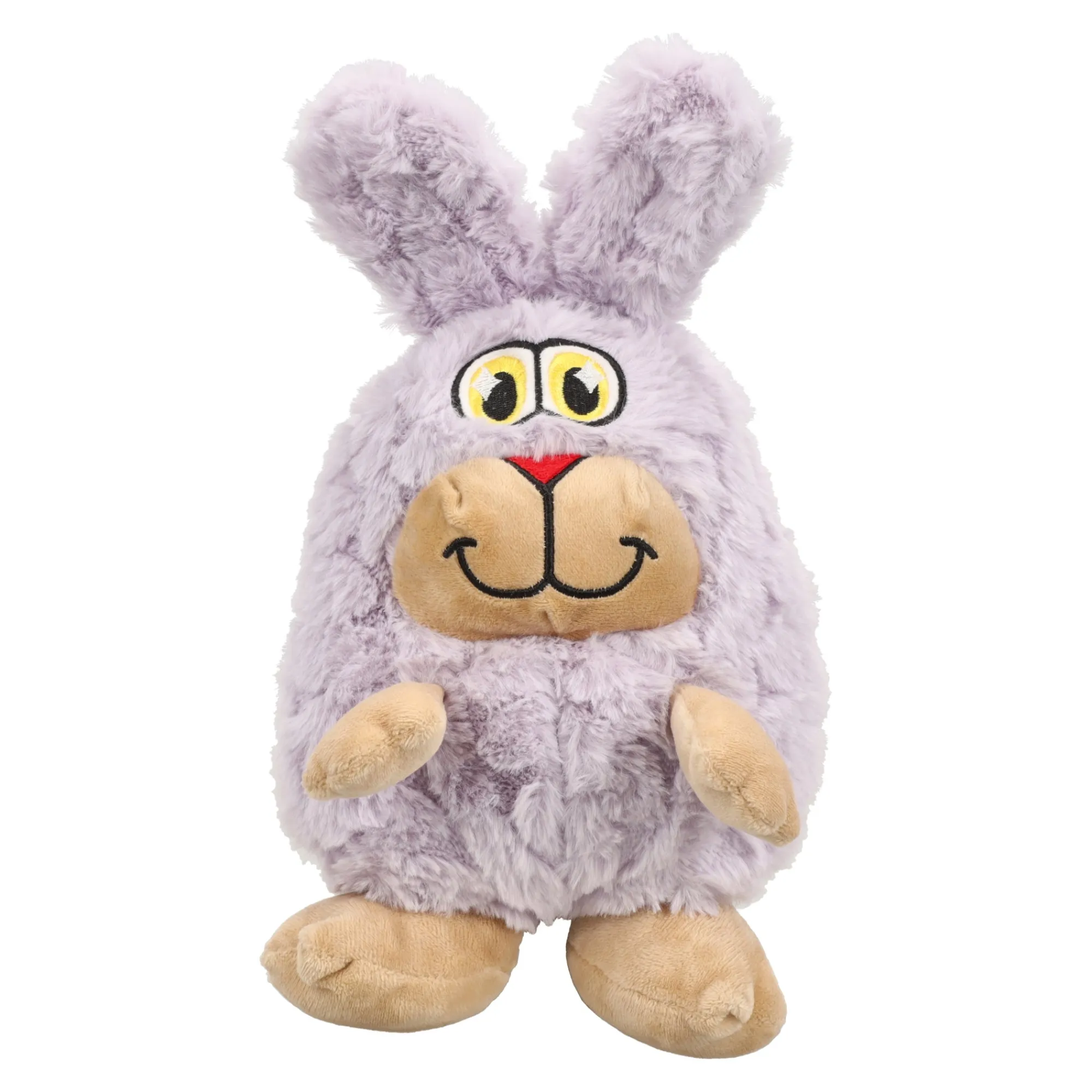 Pluche hondenspeeltje in de vorm van een konijn, met zachte paarse vacht en grappige details. Leuk om mee te knuffelen en spelen.