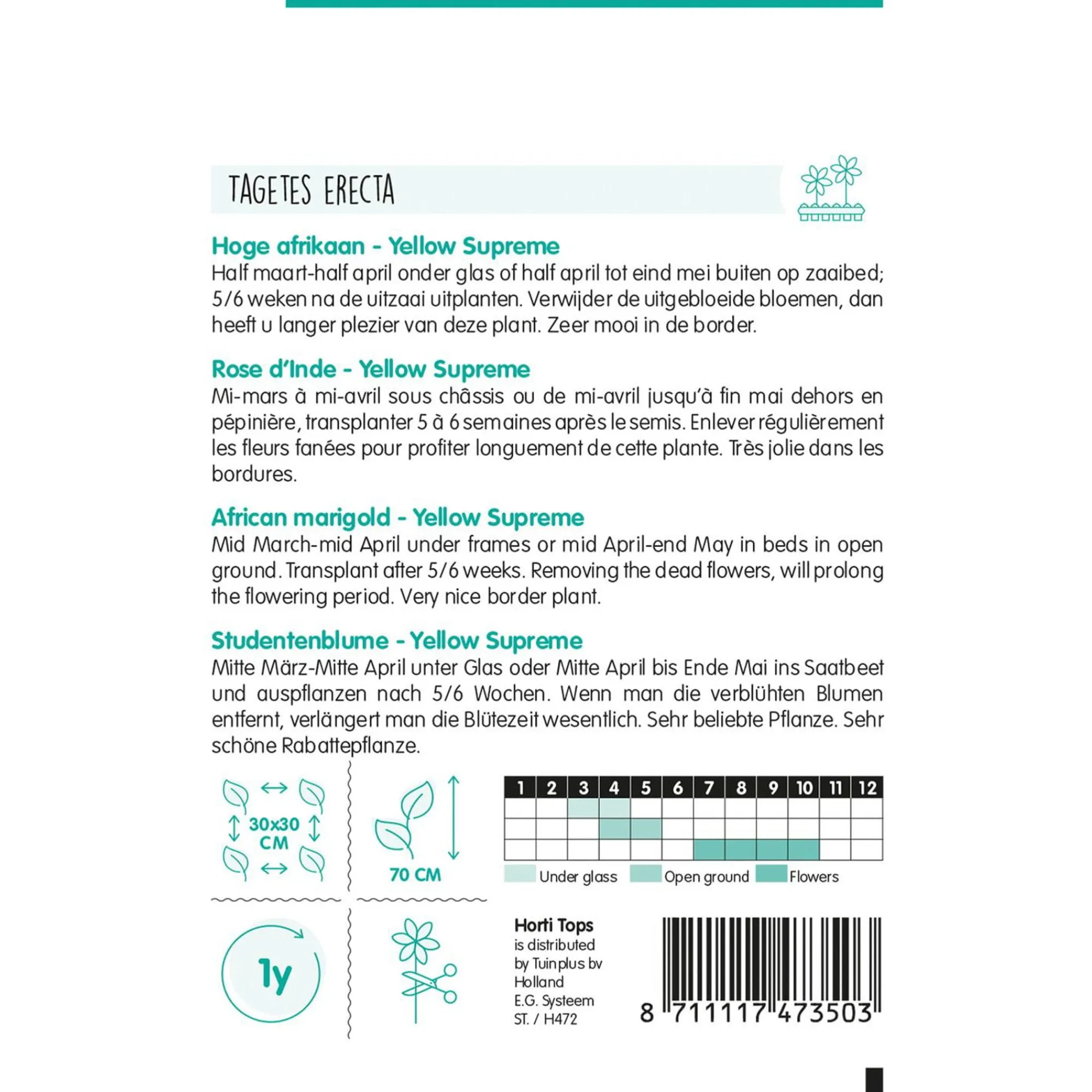Heeft heldere gele bloemen met grote knoppen die elke tuin of bloembed opfleuren. De plant is bestand tegen ongunstige omstandigheden en heeft een lange bloeitijd. Tagetesplanten (Afrikaantjes) staan erom bekend dat zij schadelijke insecten op afstand houden, terwijl ze nuttige bijen en vlinders aantrekken. Een uitstekende keuze voor een kleurrijke tuin.