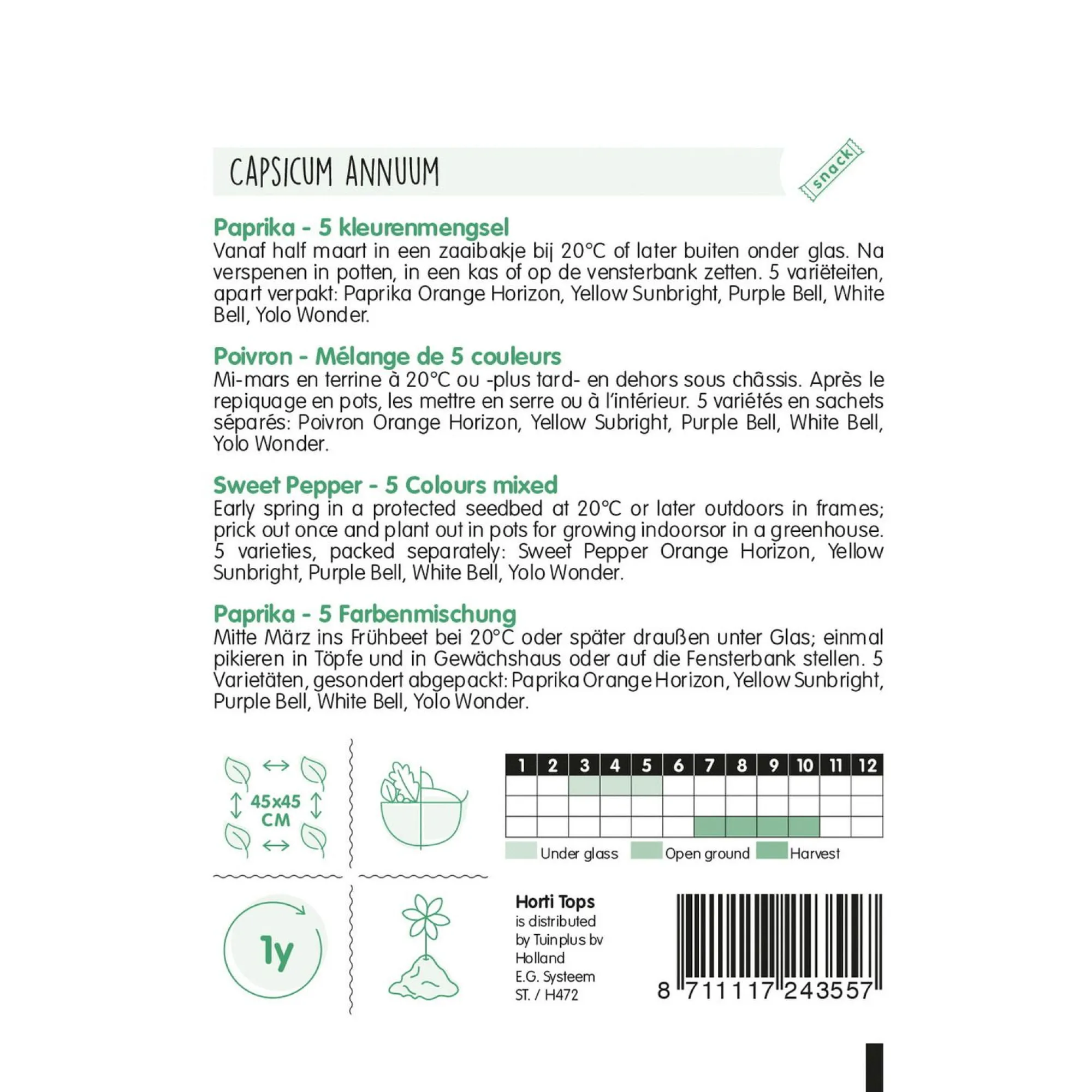 Paprika’s in vijf kleuren – Orange Horizon, Yellow Sunbright, Purple Bell, White Bell en Yolo Wonder – kunnen vanaf half maart worden gezaaid. Alle paprika’s beginnen groen en veranderen van kleur én smaak naarmate ze rijpen, met volop vitamine C in de rode varianten.