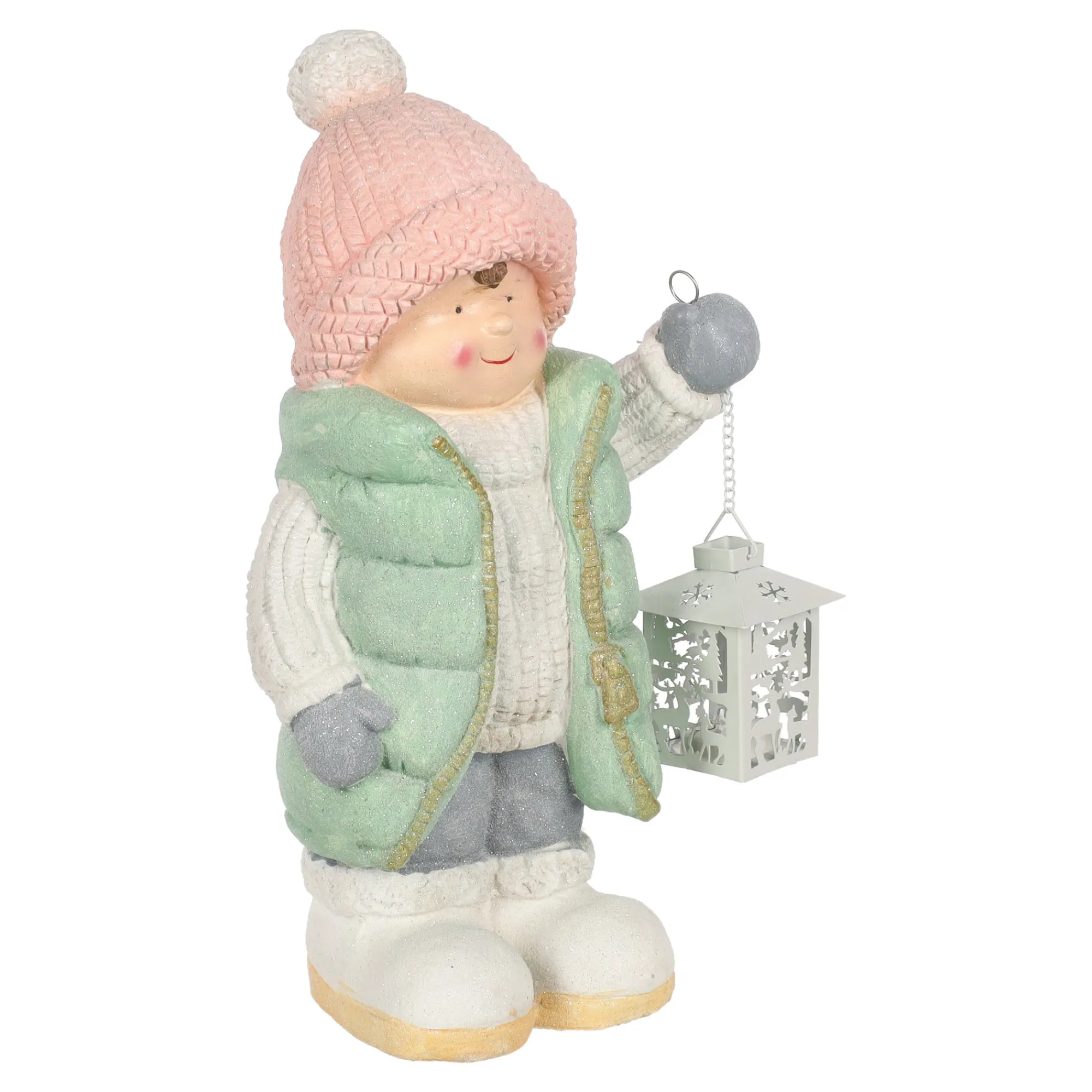 Dit vrolijke winterbeeld toont een kind in een mintgroene jas en roze muts met een metalen lantaarn in de hand. Het beeld is 43 cm hoog en zorgt voor een sfeervolle winterse uitstraling in huis of onder een overkapping.