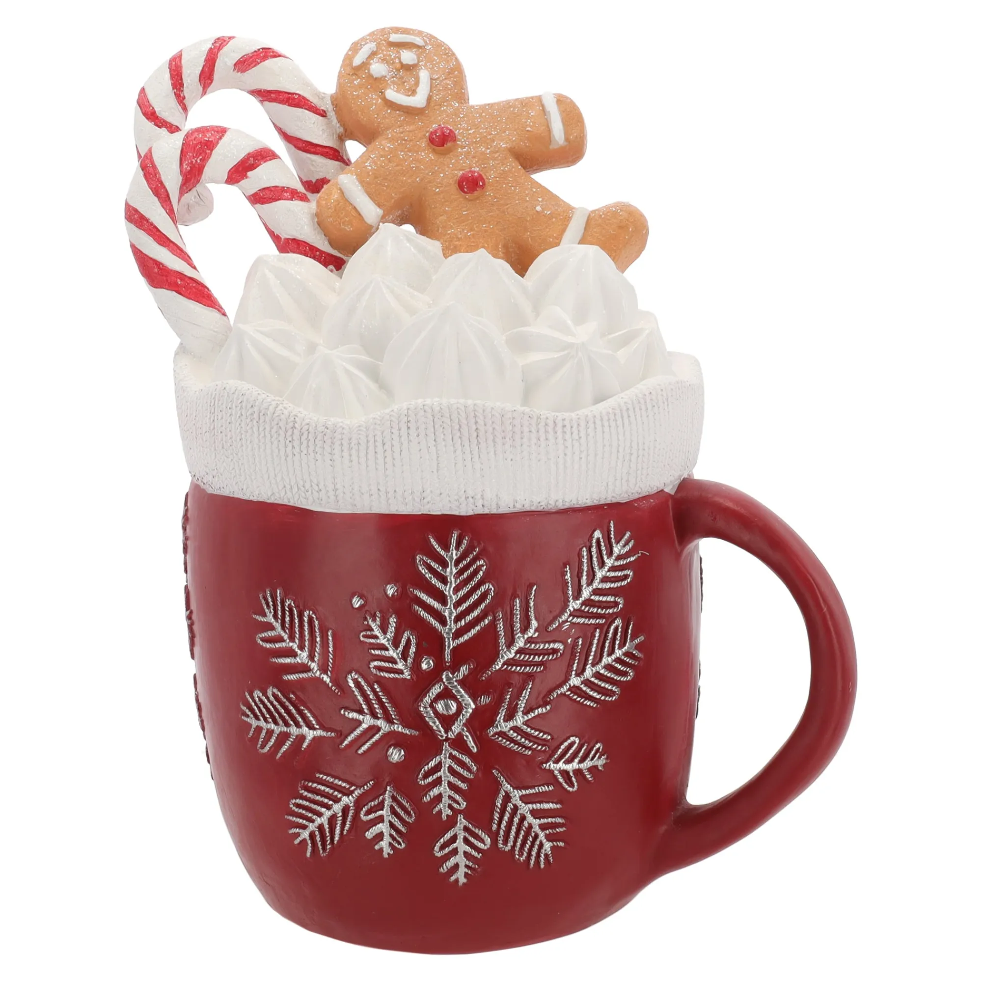 Grote decoratieve mok met winterse details, gevuld met schuimtop, candy canes en een vrolijk peperkoekmannetje. De mok heeft een rode kleur met wit sneeuwvlokmotief en ingebouwde LED-verlichting voor een warm, sfeervol effect. Gemaakt van polystone en met een hoogte van 59 cm is dit een opvallend kerststuk voor in huis of etalage.
