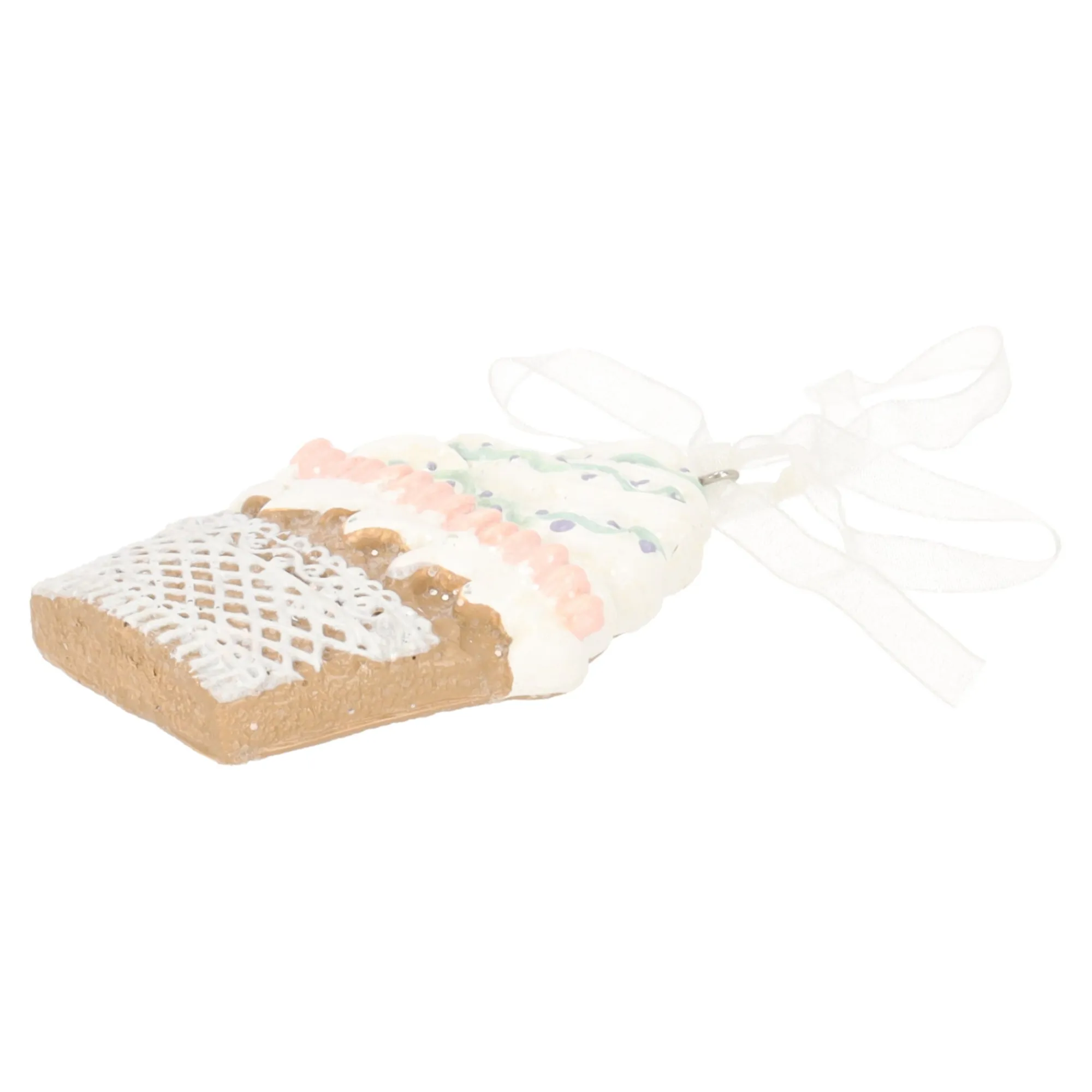 Kersthanger in de vorm van een cupcake met een gingerbread-uitstraling. De hanger is versierd met witte en pastelkleuren en heeft een wit lint om op te hangen.