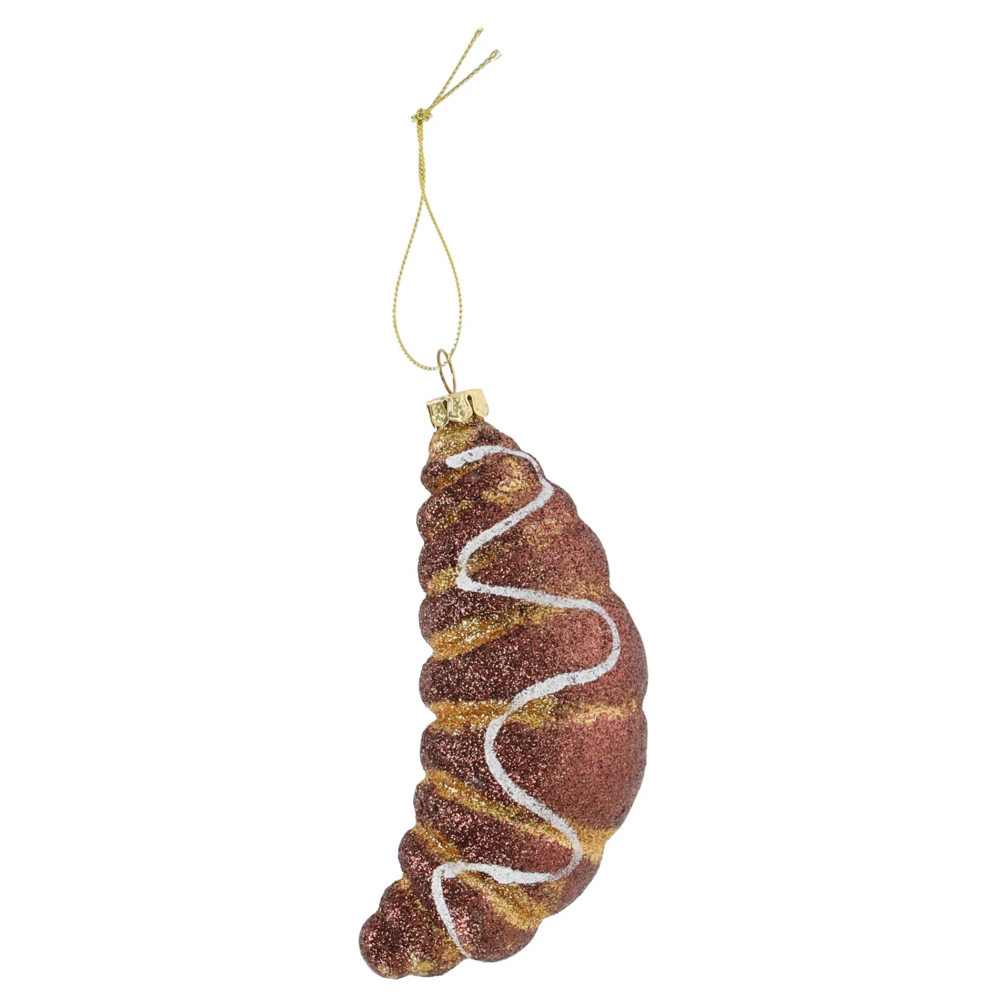 Hanger croissant in de vorm van een glinsterende croissant, afgewerkt met bruine en goudkleurige glitter en een wit zigzagdetail over de bovenkant. Met het goudkleurige ophangkoord hang je deze croissant makkelijk tussen de kerstballen voor een speels, feestelijk accent.