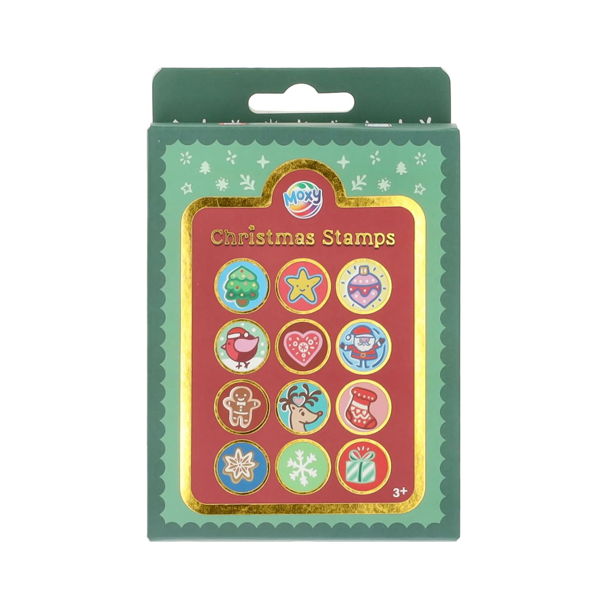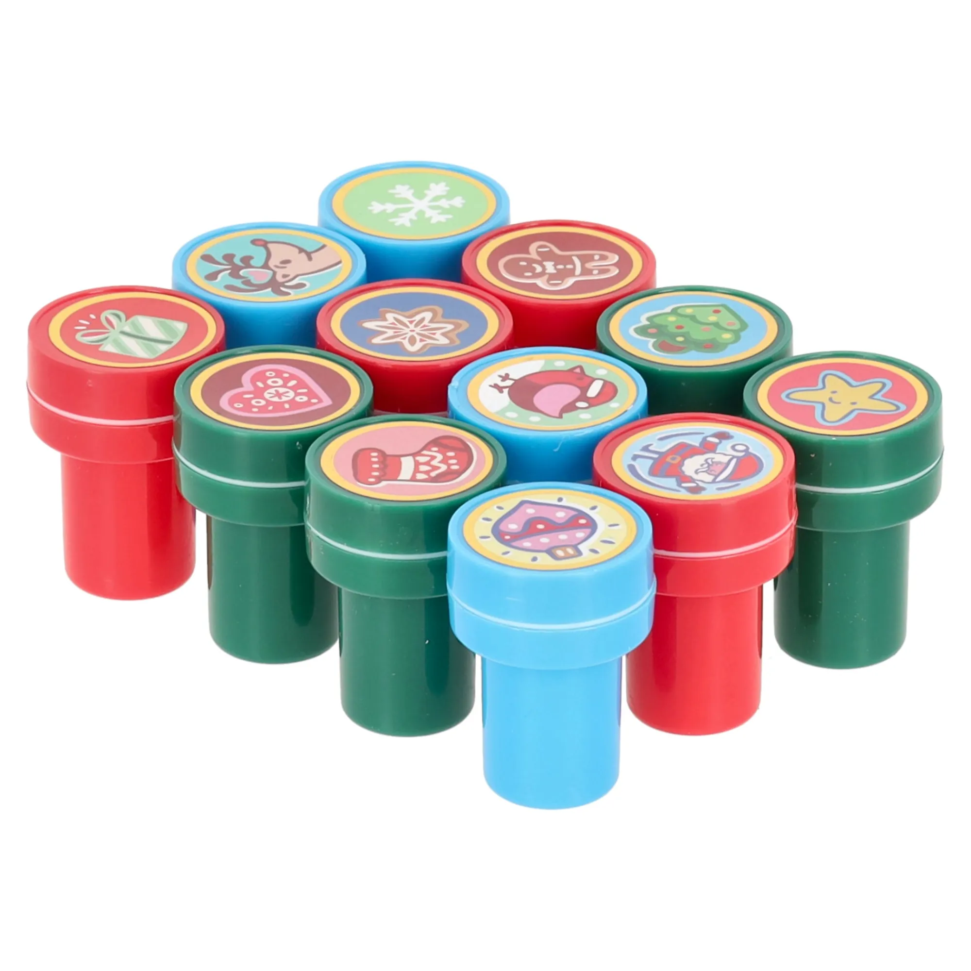 Set van 12 kerststempels in verschillende vrolijke designs zoals sneeuwvlok, rendier en kerstboom. Gemaakt van kunststof met ingebouwde inkt, leuk voor het versieren van kaarten, cadeaupapier of knutselprojecten.