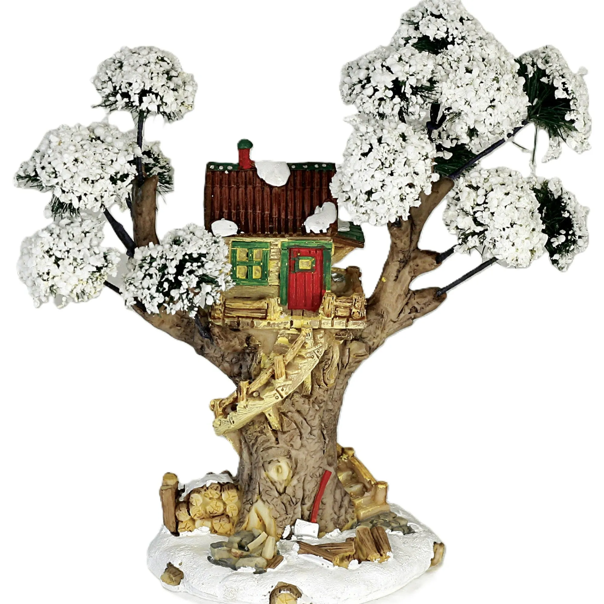 Huisje gebouwd op een grote boom, omringd door besneeuwde takken. Voorzien van trap, houtblokken en andere details die zorgen voor een speelse toevoeging aan een kerst- of winterdorp.