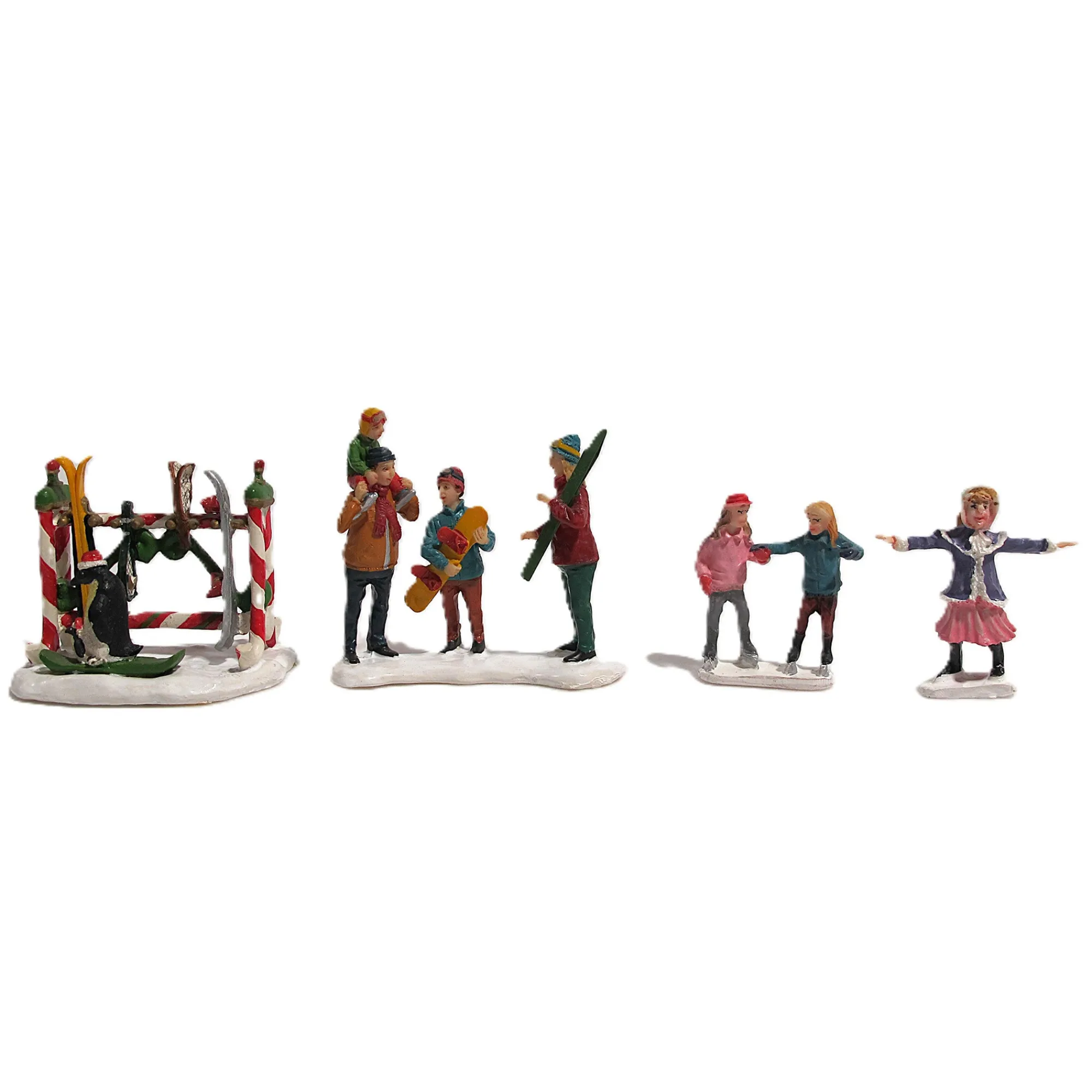 Vier figuren op ski’s en schaatsen, ideaal om je kerstdorp uit te breiden en een levendige wintersfeer te creëren.