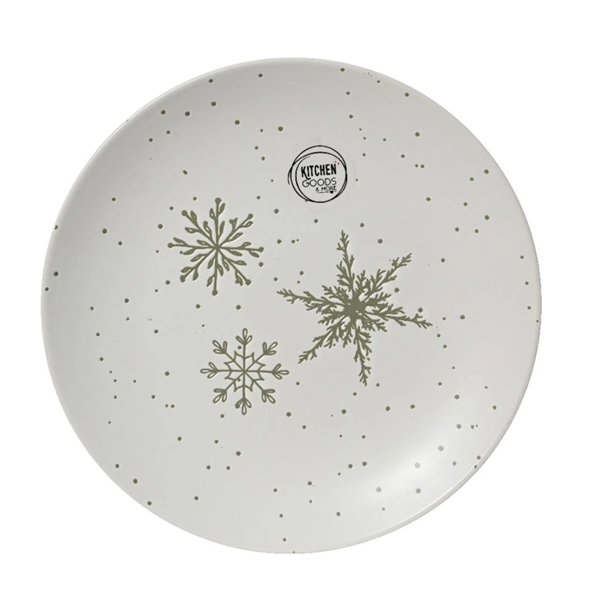 Wit bord met subtiel stippenpatroon en grijsgroene sneeuwvlokken in het midden. Ideaal als winters ontbijt- of taartbord en leuk om de tafel in kerststemming te brengen.