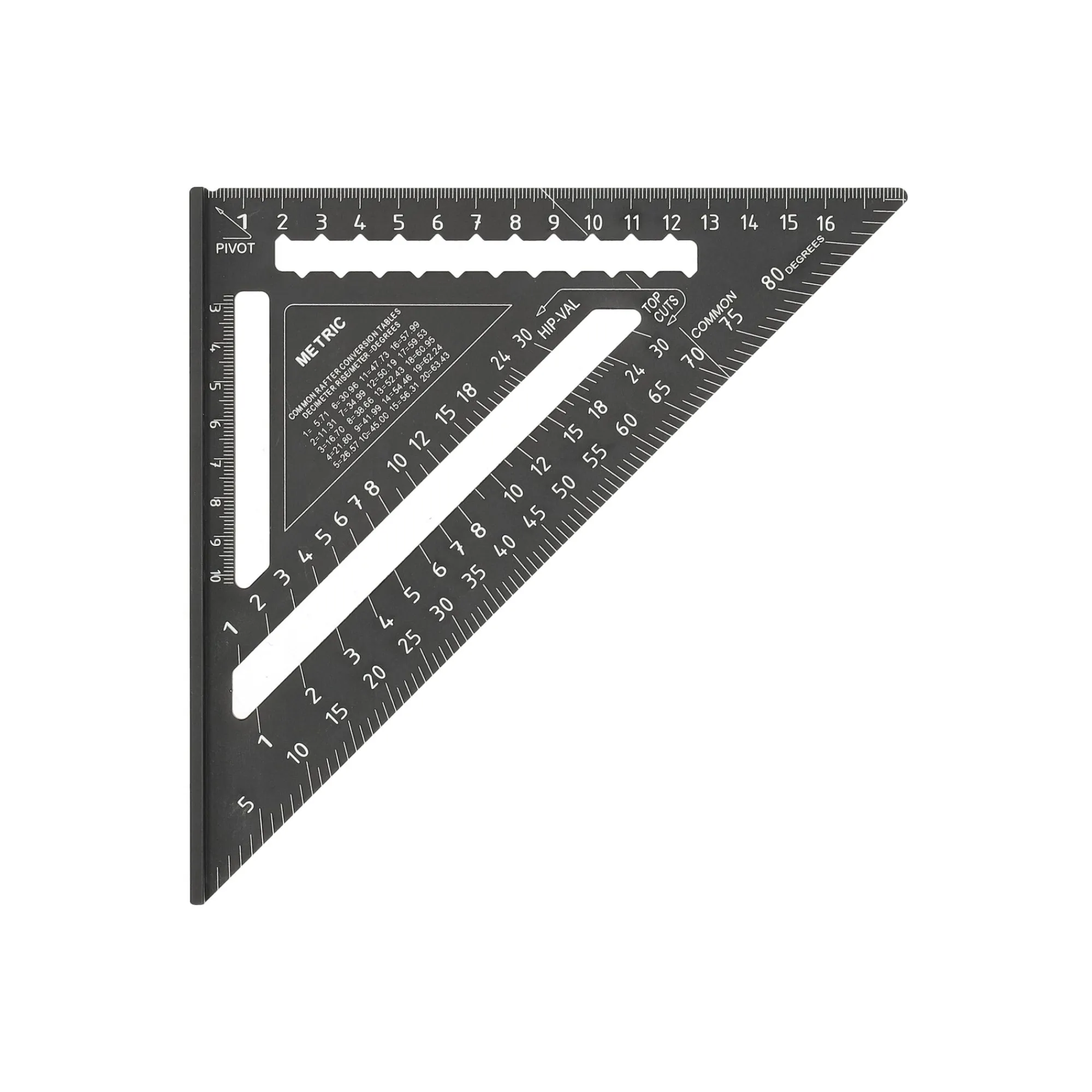 Compacte gradendriehoek voor het snel aftekenen en meten van hoeken, ideaal bij houtbewerking en zaagwerk.
