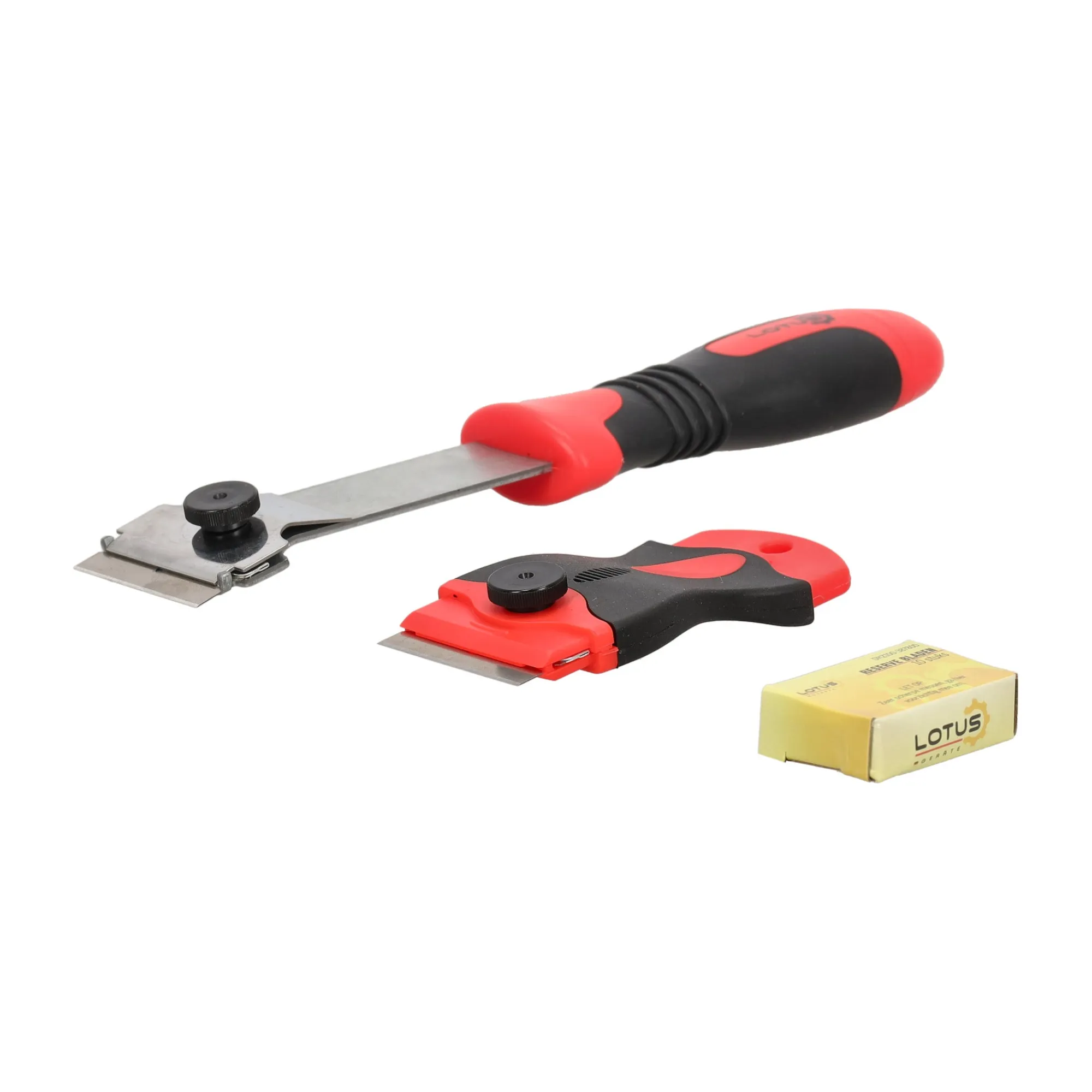 Verfschraperset van Lotus, 12-delig. Met een grote en een kleine schraper plus reservemessen kun je verf en aanslag eenvoudig van verschillende oppervlakken verwijderen.