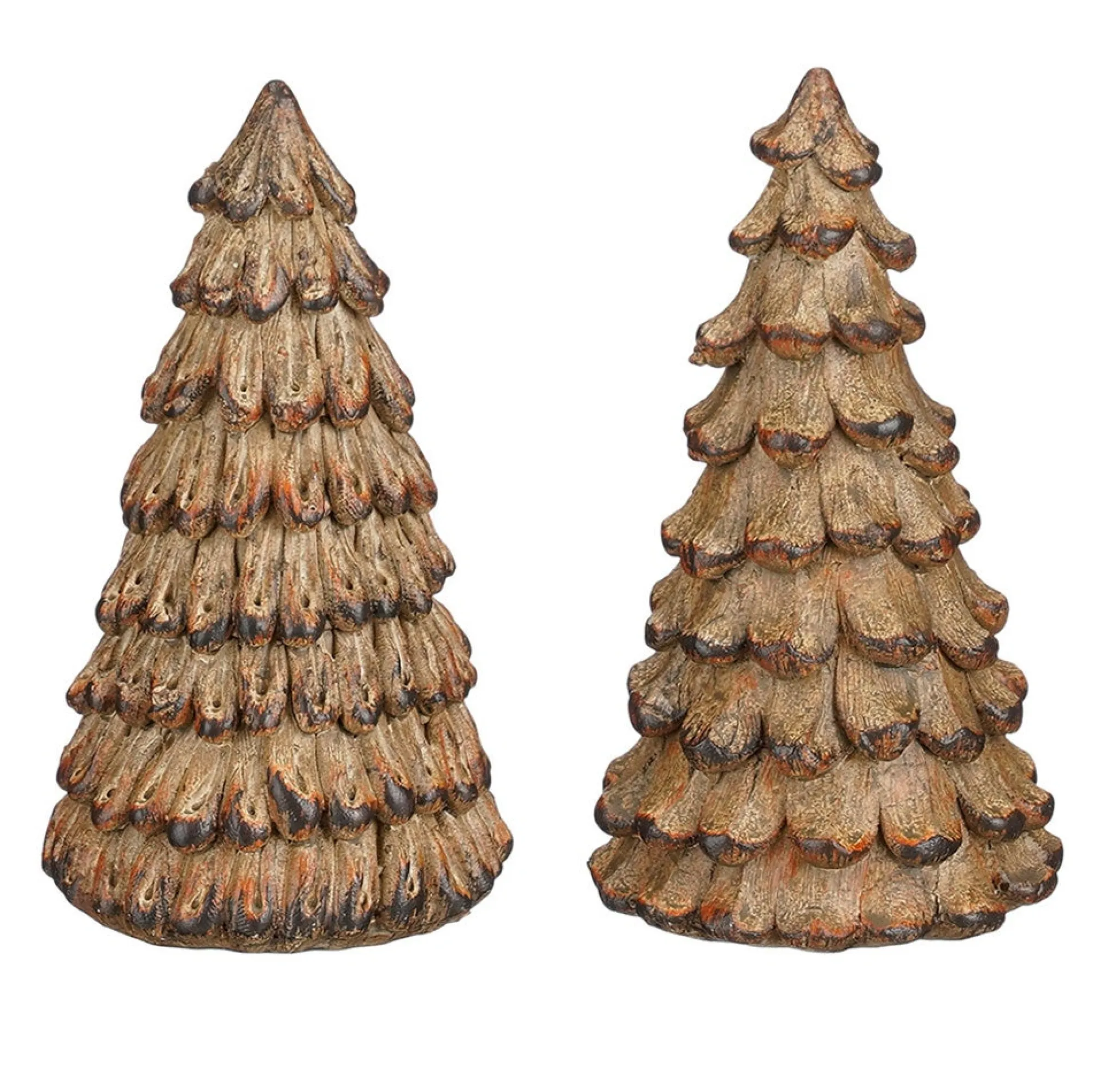 Decoratieve kerstboompjes met een warme goud-bruine finish en mooi uitgewerkte “naalden”. De boompjes staan stevig op hun voet en passen perfect op dressoir, vensterbank of in een kerststukje. Leuk om samen neer te zetten voor een natuurlijke, maar toch chique kerstsfeer in huis.